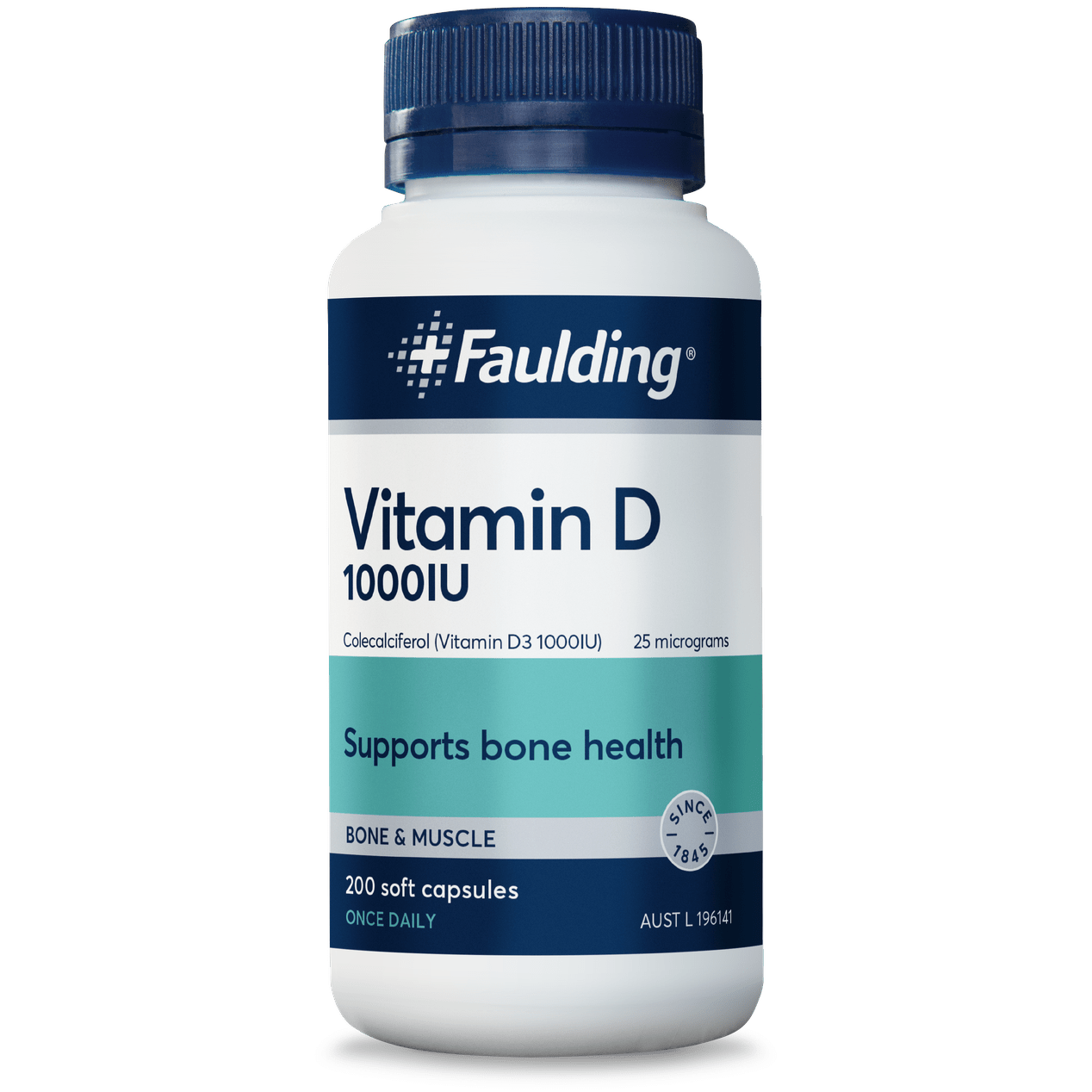 Faulding® Vitamin D 1000IU aids in the absorption of calcium which supports the development and maintenance of strong, healthy bones. Vitamin D is mainly produced in our skin by a reaction that requires sunlight. People who limit their exposure to sunlight may have an increased need for vitamin D supplementation. Faulding® Remedies Vitamin D 1000IU may also assists with calcium absorption.