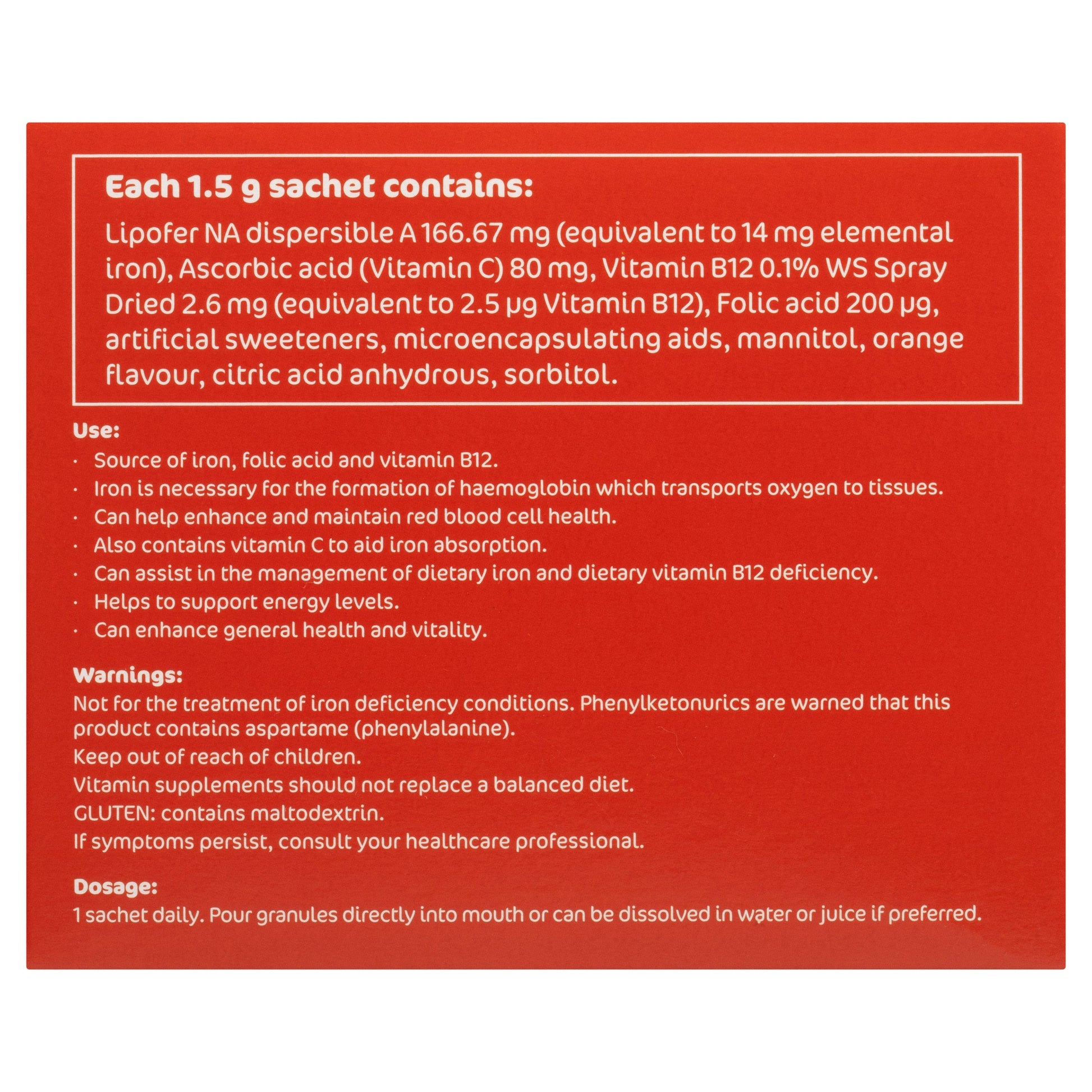 Source of iron, folic acid, and vitamin B12. Also contains vitamin C to aid iron absorption.