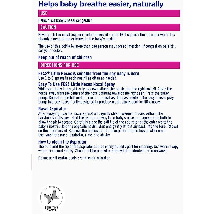 It's important to keep your baby's nose clear as a blocked nose can disrupt sleep, nursing and feeding. Fess Little Noses loosens and thins nasal mucus to help clear nasal passages. The special aspirator helps to remove the nasal mucus so your baby can breathe easier, naturally.