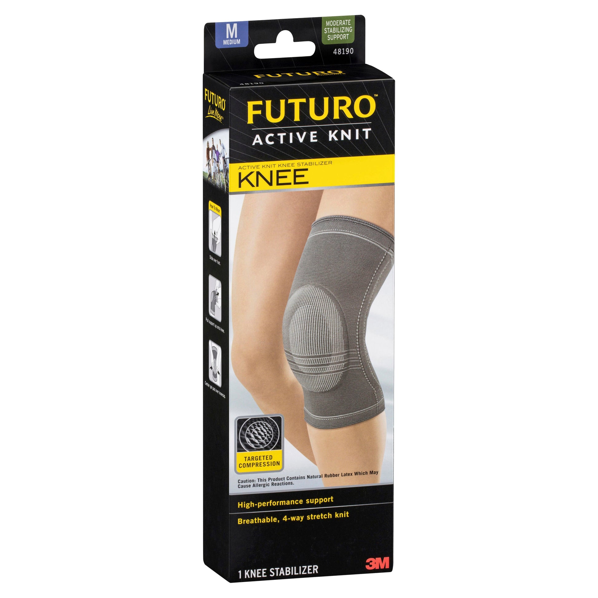 Instructions : The FUTURO™ Active Knit Knee Stabiliser has been engineered specifically to provide support to weak and sore muscles above and below the knee, help reduce swlling and provide stability. Wear all day or during activities which lead to discomfort