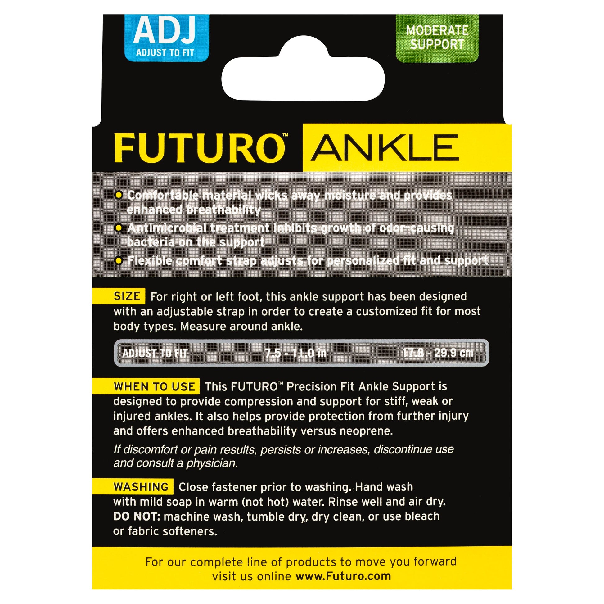 The FUTURO Precision Fit Ankle Support is designed to provide compression and support for stiff, weak or injured ankles. It also provides protection from further injury and offers enhanced breathability versus neoprene.