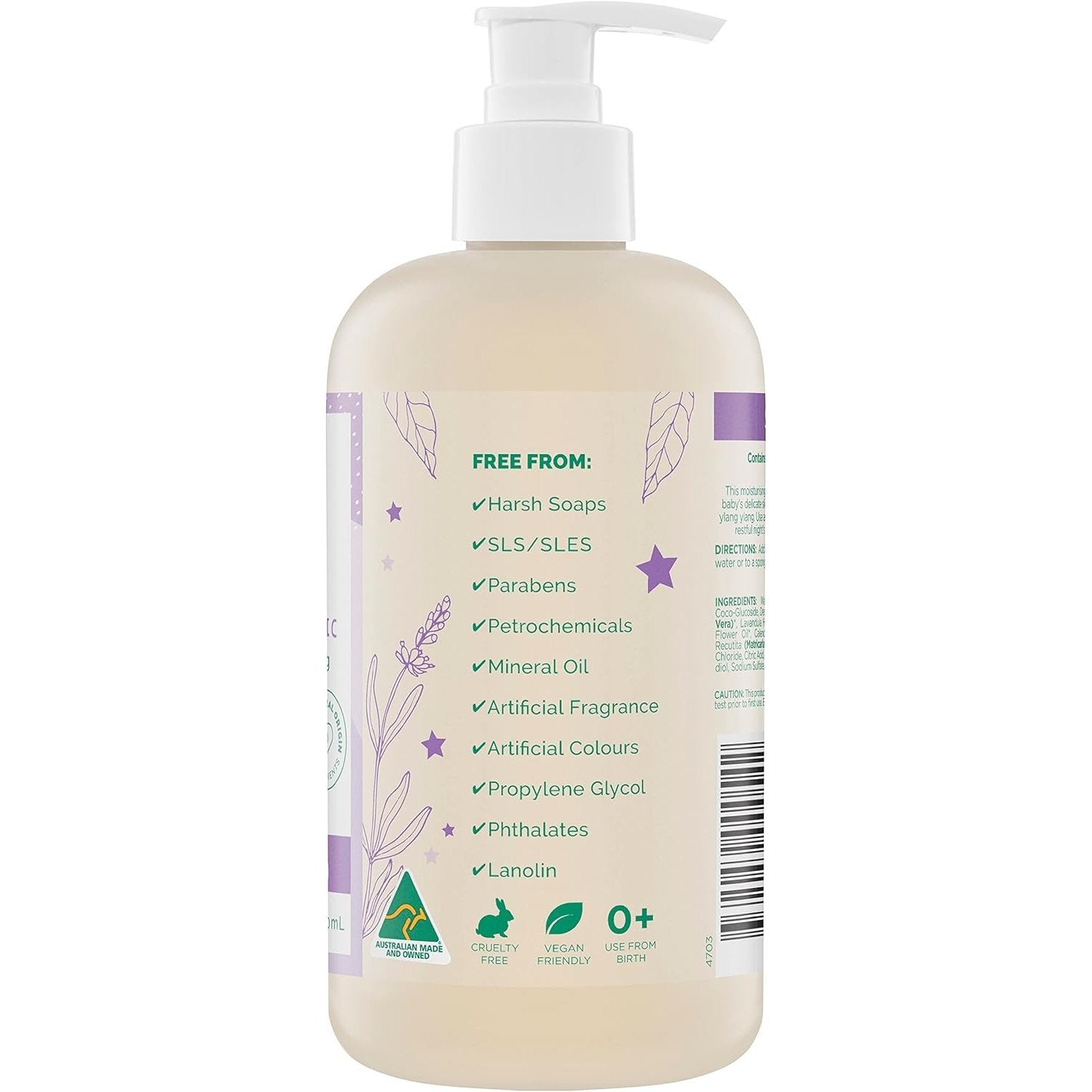 A moisturising, soap-free wash that gently cleanses and cares for your baby's delicate skin. Enriched with the calming essence of organic lavender and organic ylang ylang. Use as part of your baby's bedtime routine to encourage a restful night's sleep. Sensitive skin formula and eczema friendly. Suitable to use from birth. Dermatologically tested and suitable for sensitive skin.