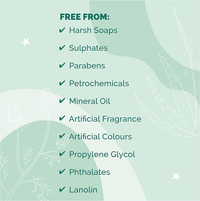 Free from: Harsh soaps, sulphates, parabens, petrochemicals, mineral oil, artificial fragrance, artificial colours, synthetic preservatives, propylene glycol, phthalates, lanolin