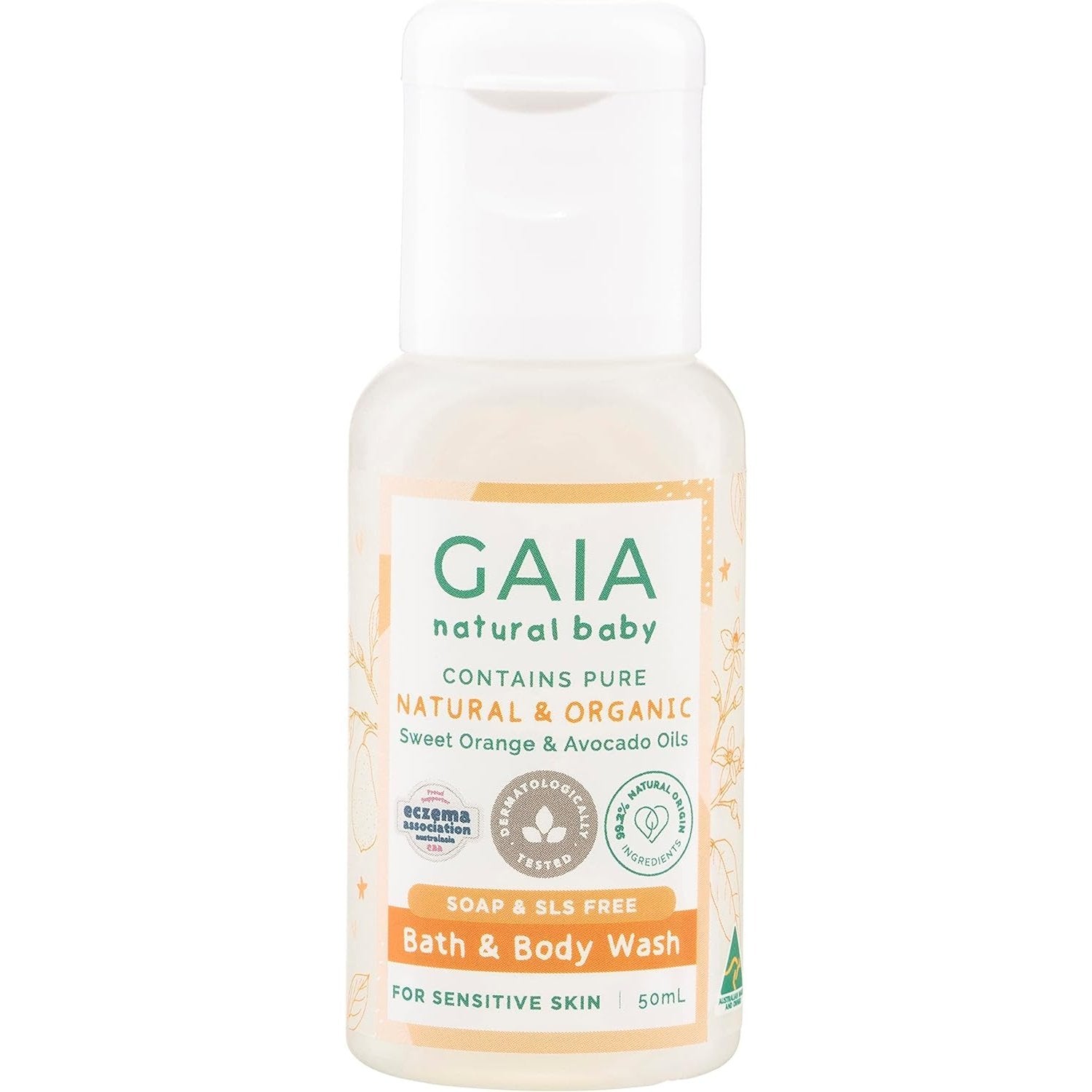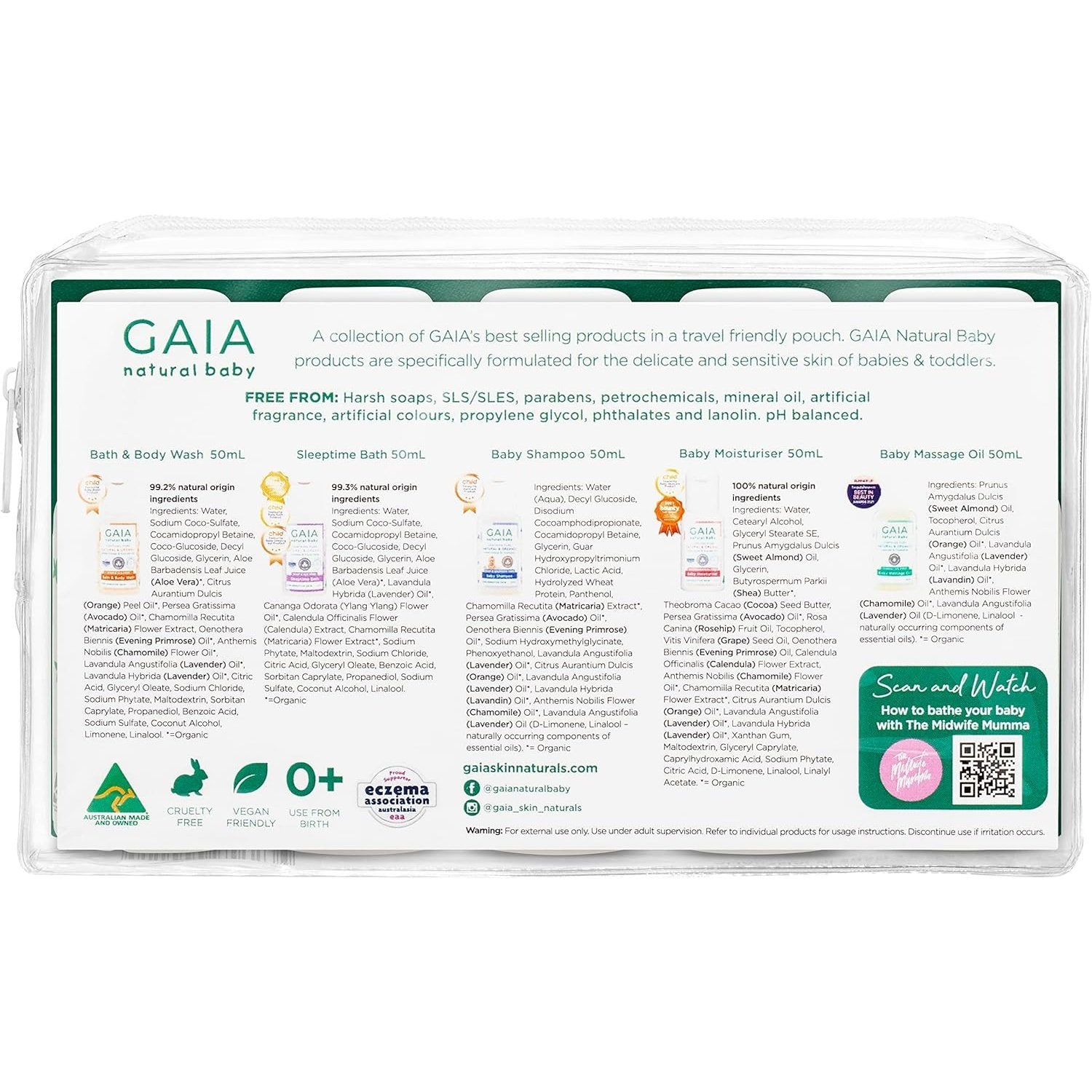 Boxed Contents: GAIA Bath & Body Wash 50mL, GAIA Sleeptime Bath 50mL, GAIA Baby Shampoo 50mL, GAIA Baby Moisturiser 50mL and GAIA Baby Massage Oil 50mL.