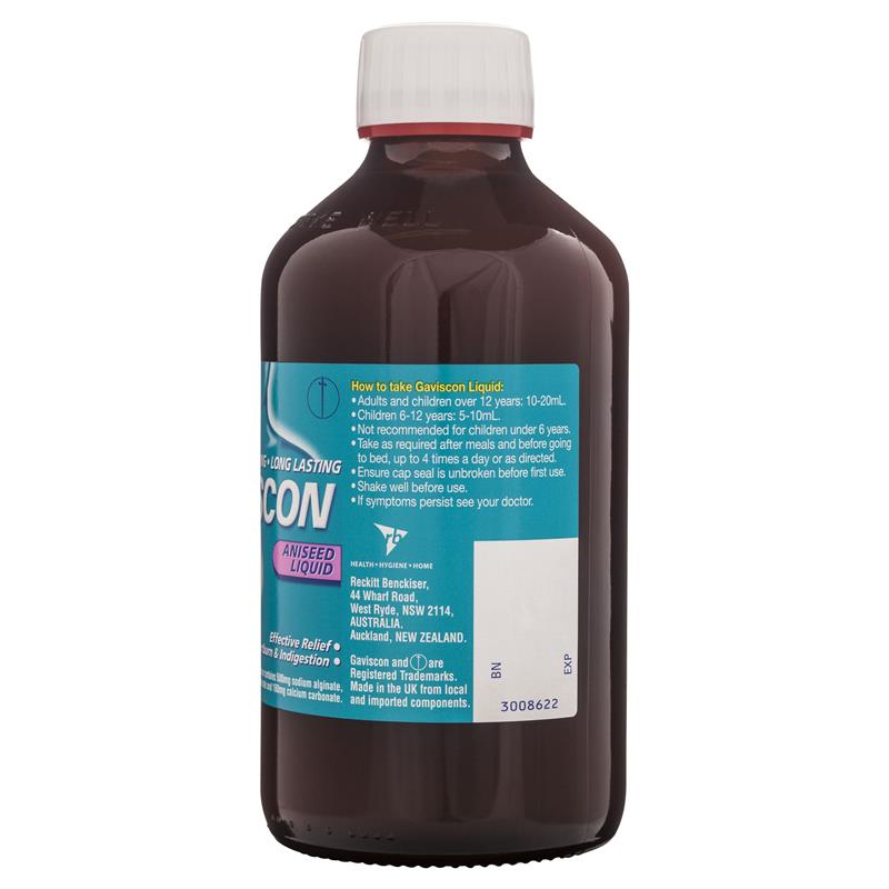 Gaviscon Aniseed Liquid 600ml works by forming a raft (a protective barrier) on top of the stomach contents soon after it has made contact with the stomach acid. The raft acts as a strong physical barrier and helps to keep stomach contents in the stomach where they belong and not in the food pipe where they hurt.