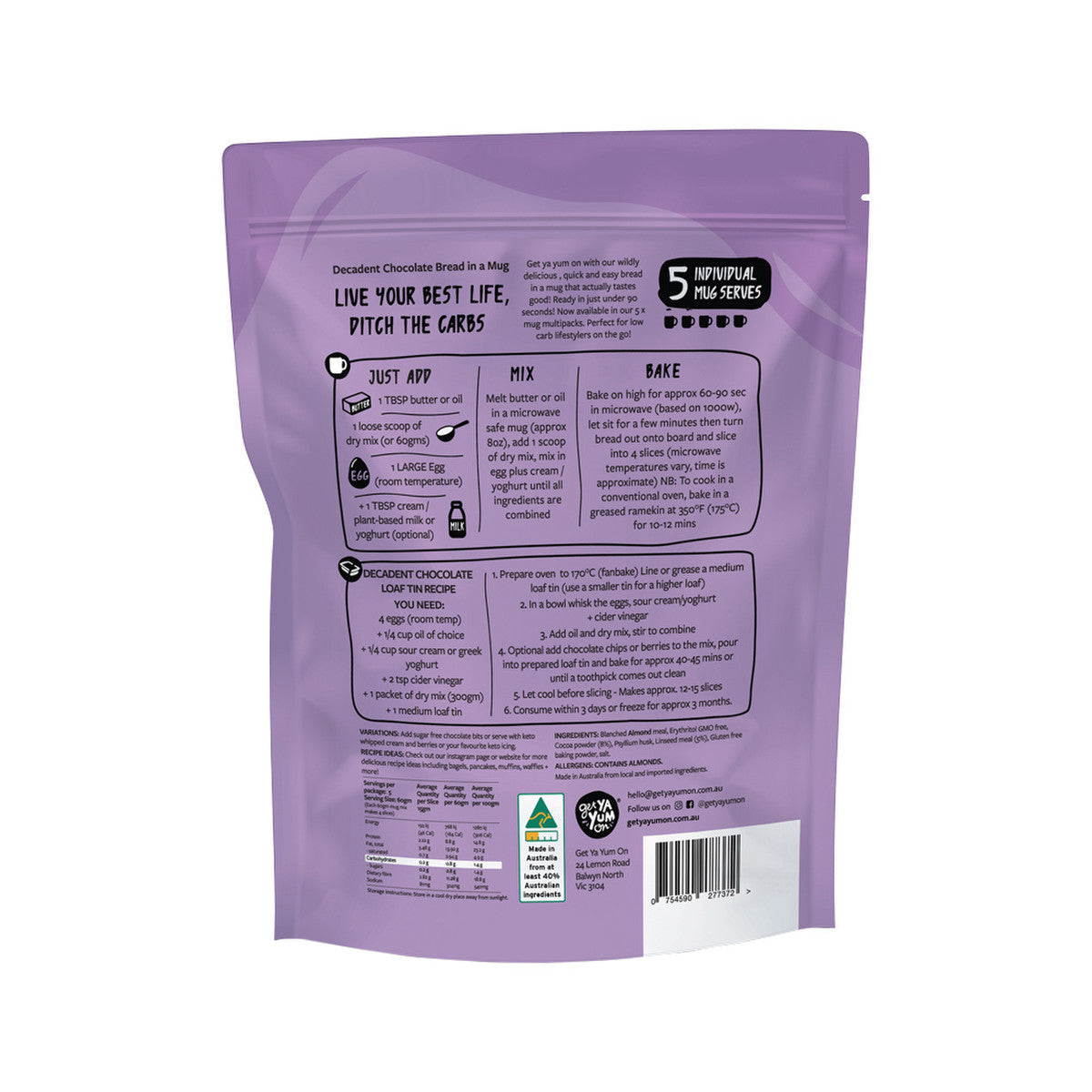 Get Ya Yum On (90 sec Keto) Bread In A Mug Decadent Chocolate 300g