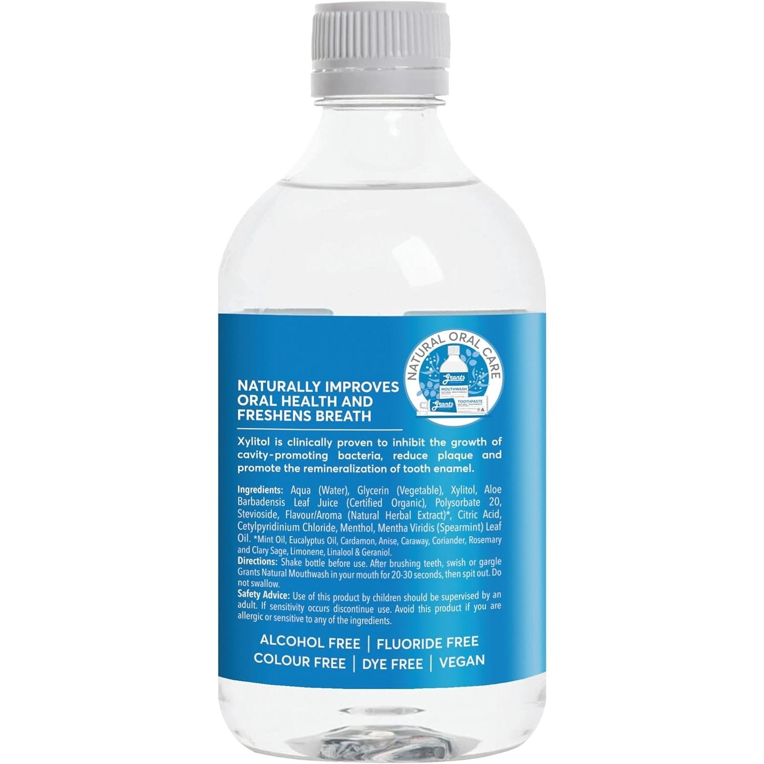 Say goodbye to bad breath and tooth decay with Grants Xylitol Natural Mouthwash. The dental benefits of Xylitol, combined with natural cleansing herbs like eucalyptus, cardamom and rosemary make this the healthy way to freshen your breath. With a mild mint flavour and none of the harmful effects of alcohol, this mouthwash is the perfect way to end to your daily oral care routine. Safe for the whole family.