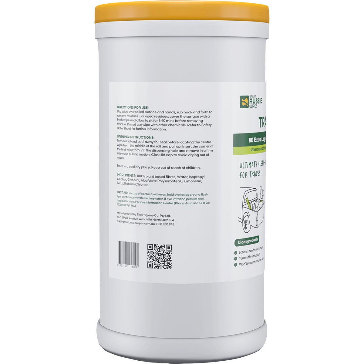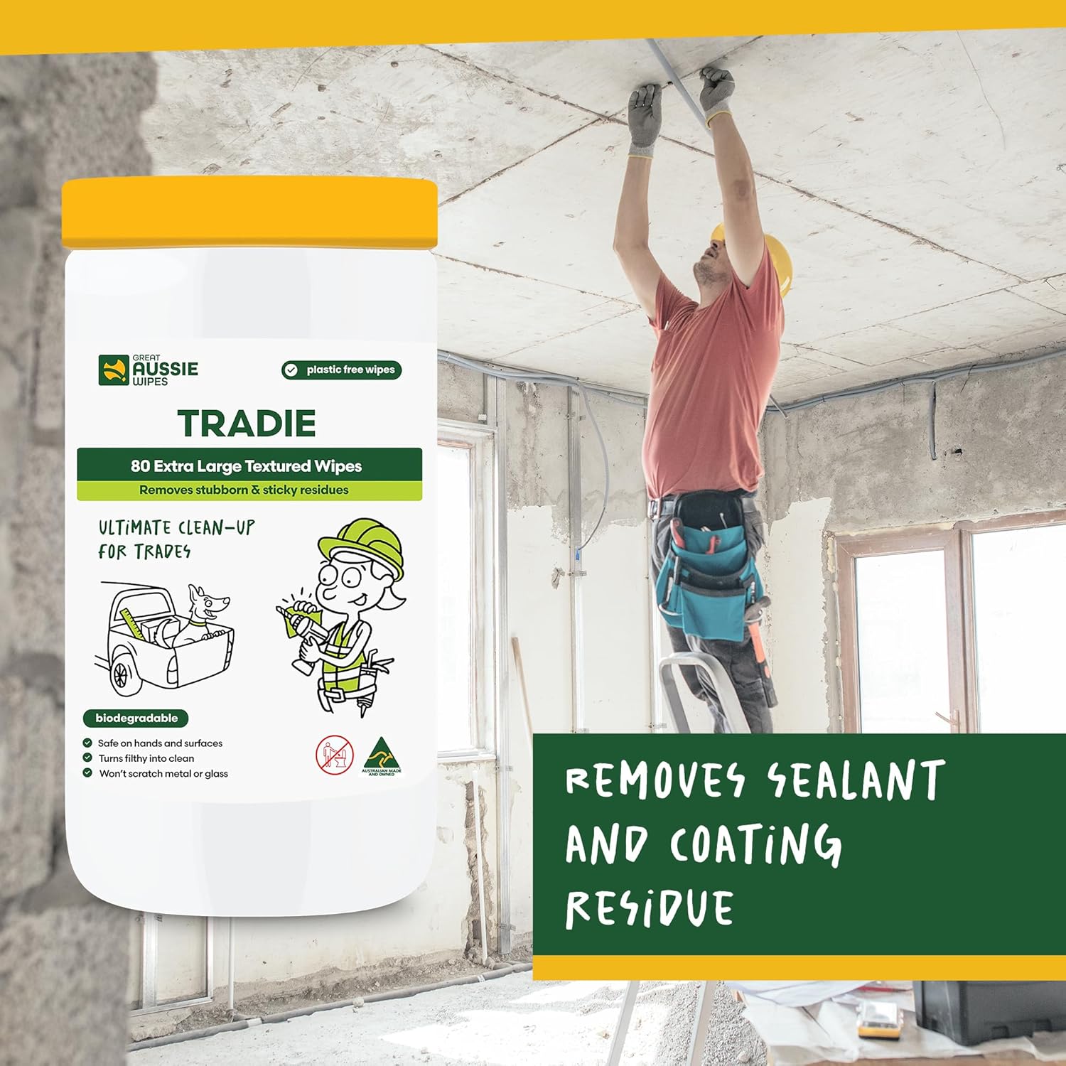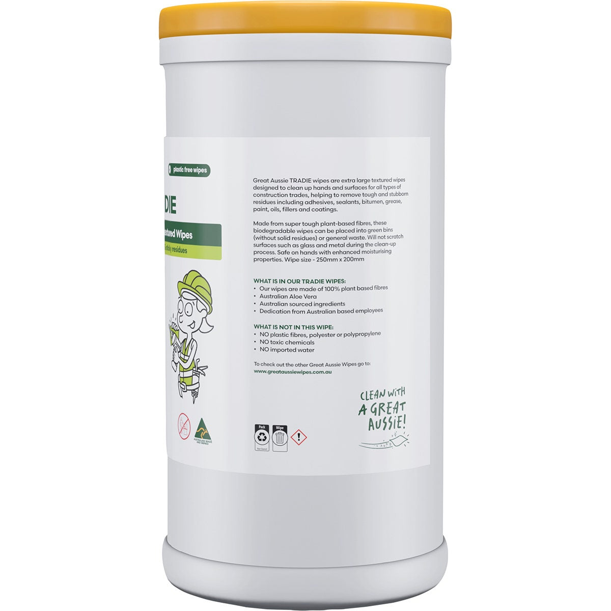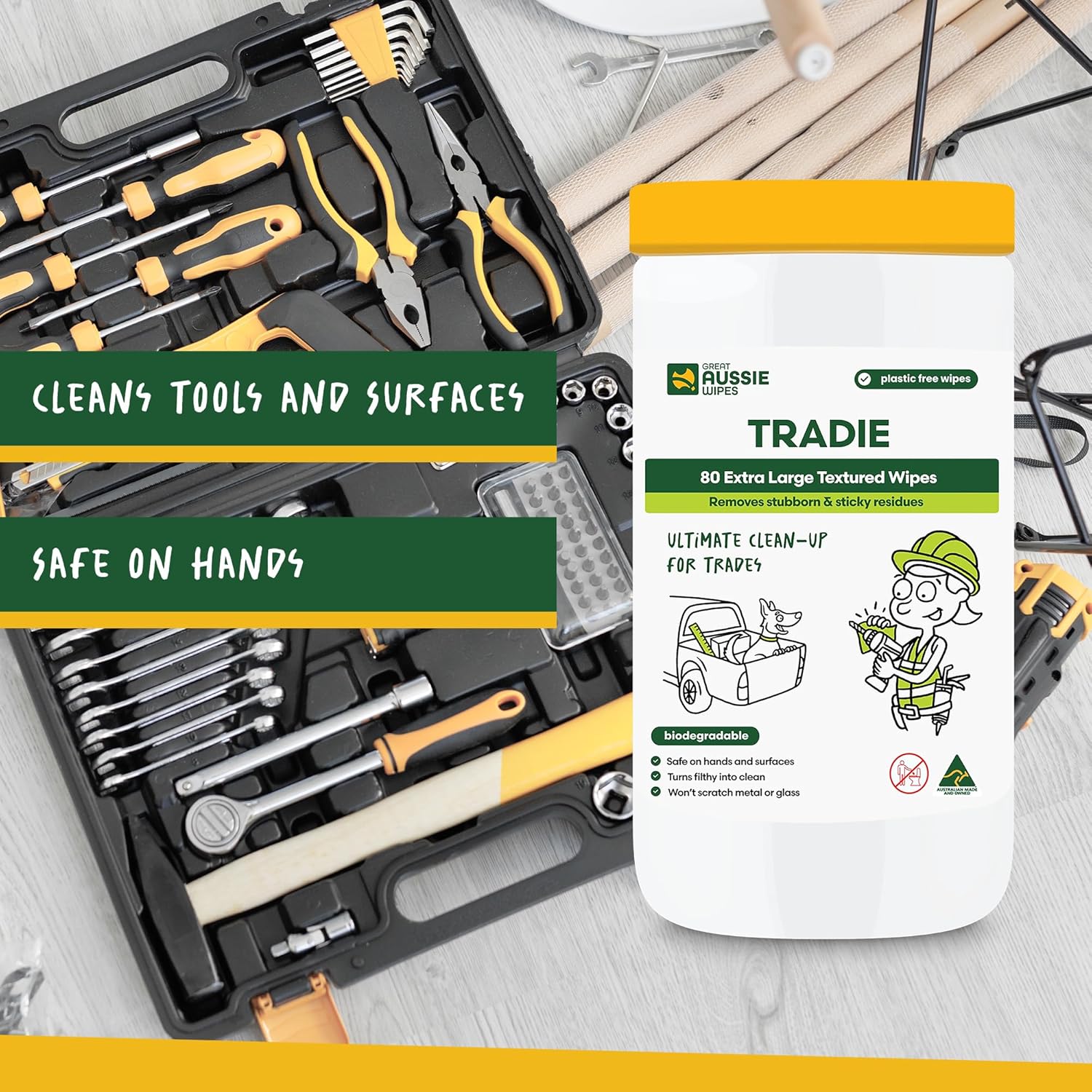 The Great Aussie Wipes Tradie Extra Large Textured Wipes 80pk are perfect for heavy duty cleaning. Their extra large size and textured surface effectively remove tough dirt and grime. With 80 wipes in each pack, you'll have plenty to get the job done. Keep your workspace clean and tidy with these high-quality wipes.