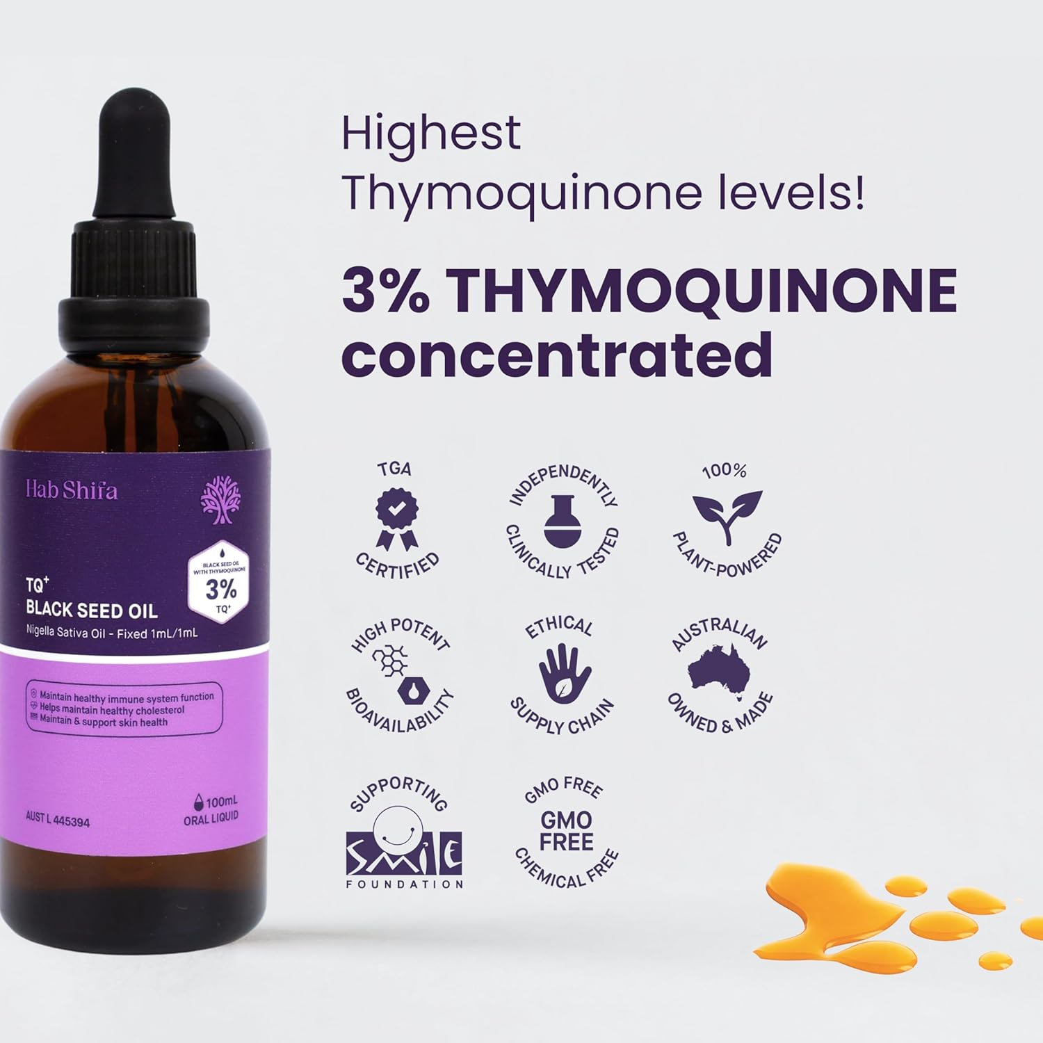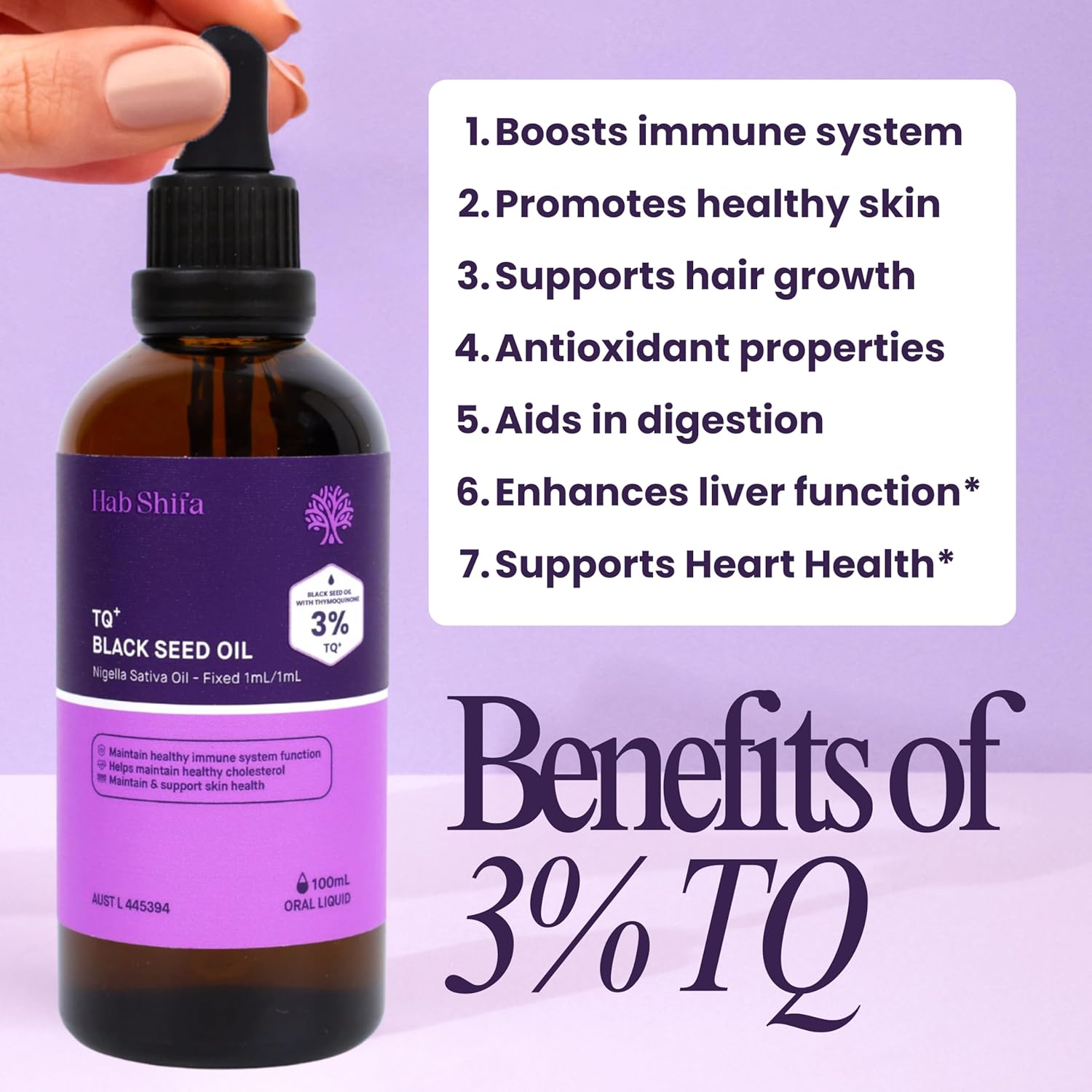 Hab Shifa TQ+ Black Seed Oil is a top-quality, 100% pure oil that contains the powerful antioxidant Thymoquinone. This oil provides numerous health benefits, including boosting the immune system, promoting healthy skin and hair, and aiding in digestion. With a professional and scientific tone, this oil is a must-have for those seeking natural and effective wellness solutions.