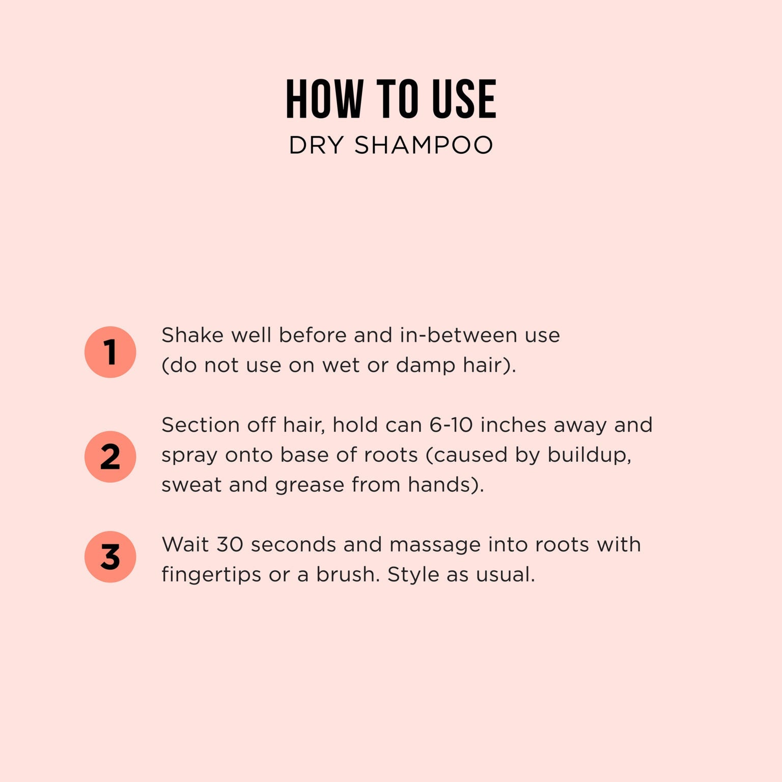 Shake well before and in-between use. Section off hair, hold the can 6-10 inches away and spray onto roots. Wait 30 seconds and brush through or massage with fingertips. Style as desired.
