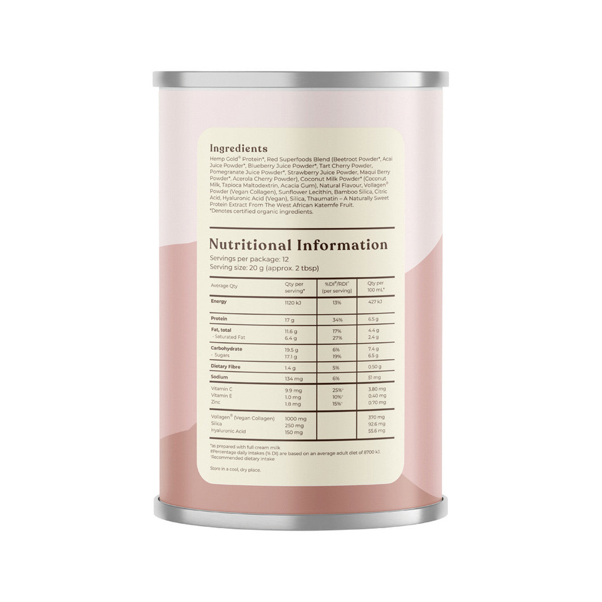 Hemp Gold® Protein*, Red Superfoods Blend (Beetroot Powder*, Acai Juice Powder*, Blueberry Juice Powder*, Tart Cherry Powder, Pomegranate Juice Powder*, Strawberry Juice Powder, Maqui Berry Powder*, Acerola Cherry Powder), Coconut Milk Powder* (Coconut Milk, Tapioca Maltodextrin, Acacia Gum), Natural Flavour, Vollagen® Powder (Vegan Collagen), Sunflower Lecithin, Bamboo Silica, Citric Acid Hyaluronic Acid (Vegan), Silica, Thaumatin – A Naturally Sweet Protein Extract From The West African Katemfe Fruit.