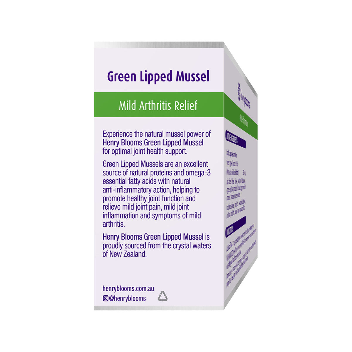 Henry Blooms Green Lipped Mussel is sourced from the clean, clear waters of New Zealand. Freeze-dried within hours of harvest, Henry Blooms Green Lipped Mussel capsules contain glycosaminoglycans, omega 3 essential fatty acids, and trace nutrients to help provide temporary relief from pain and inflammation associated with arthritis, relieve painful, stiff, and swollen joints and maintain good joint health.