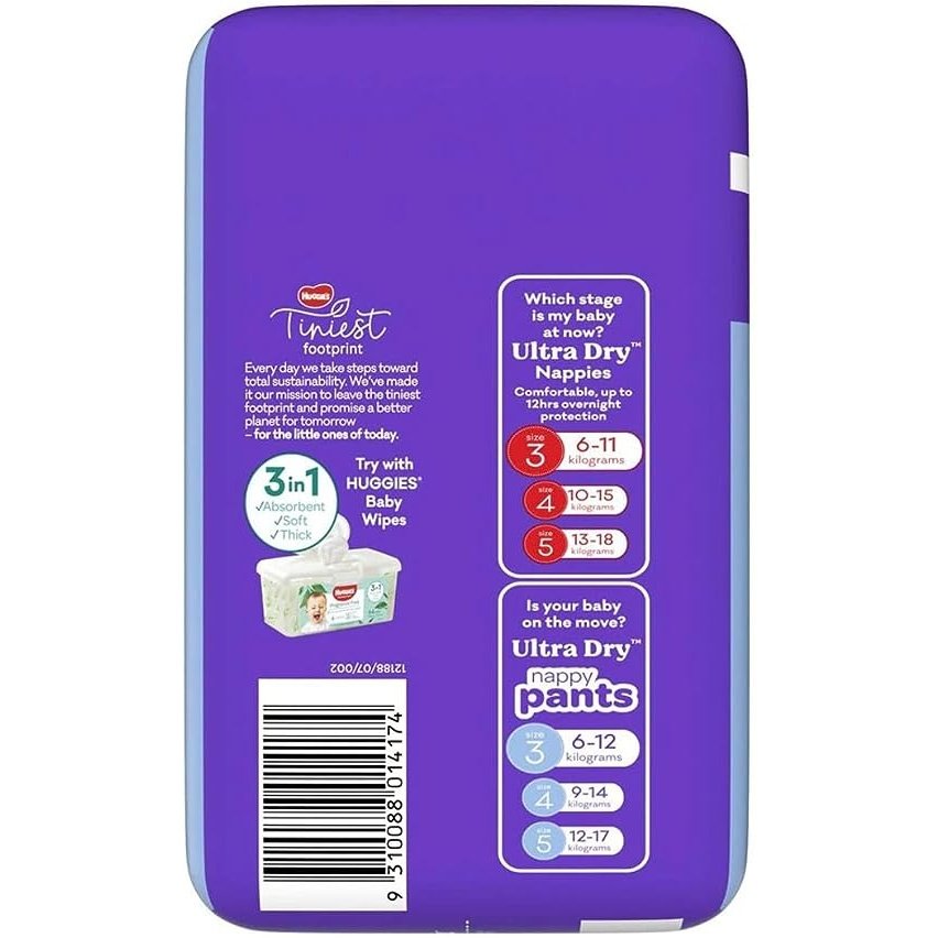 Huggies Ultra Dry Nappy Pants with SlimFLEX Absorbent Core are made to move, just like your little one. They are 25% thinner and 70% more flexible* to allow the baby to move more freely. Features Huggies most advanced moisture lock technology with 5 slimline layers that instantly absorb, draw in moisture, and lock it away from bubs skin, for superior dryness and up to 12hrs leakage protection, making them perfect for day and all night. The pull-up design and soft and stretchy 360 waistbands make change time quick and easy. Huggies Ultra Dry Nappy Pants are the ONLY Nappy Pants with tailor-made absorbency up front for boys where they need it most.