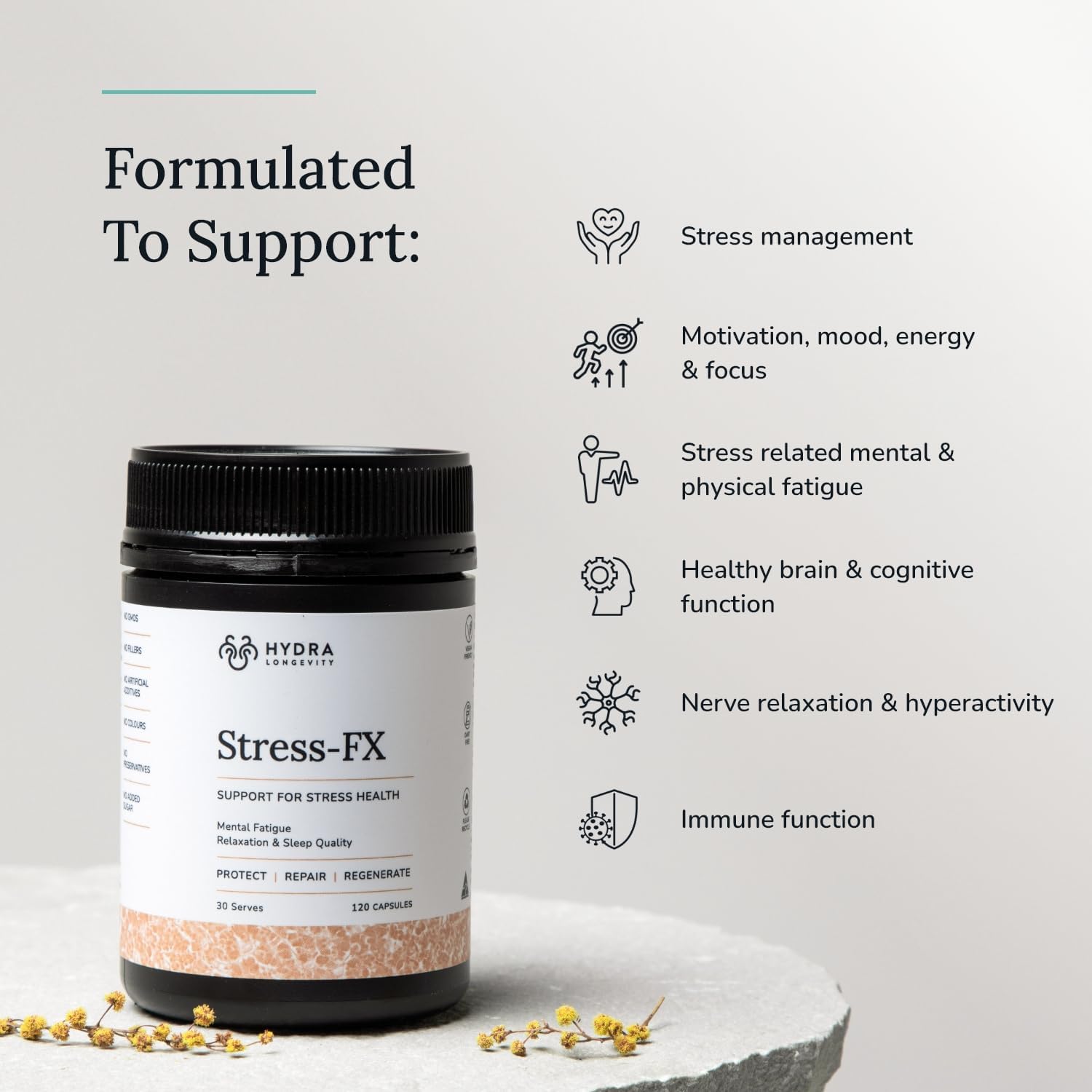 Stress-FX is a scientifically advanced formula designed to support stress management and work at a cellular level. Practitioner developed at optimal strength, the 3 stacks combine a unique blend of herbal medicines and phyto-nutrients traditionally used to help relax and calm nerves, reduce stress-induced mental and physical fatigue and protect your cells from the ageing effects of stress.
