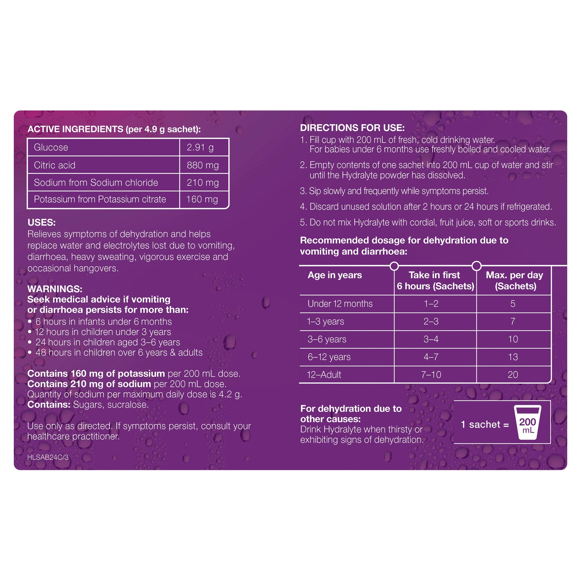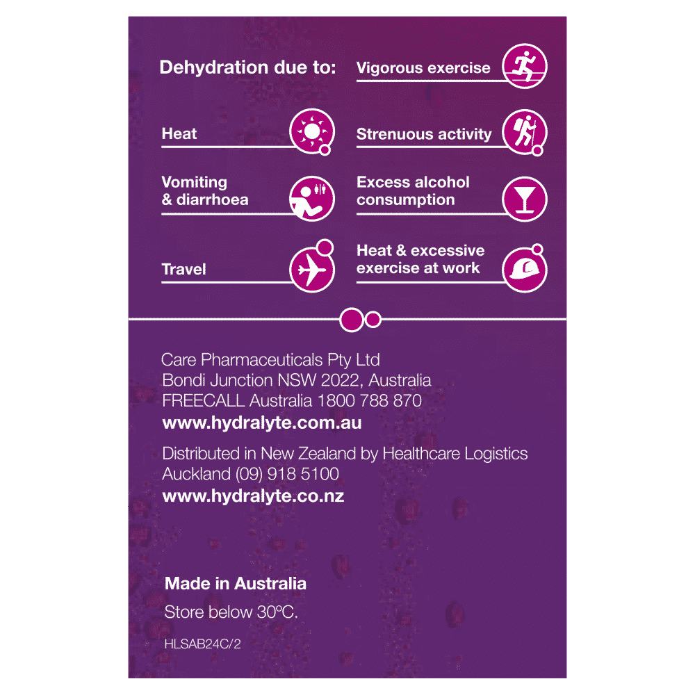 Hydralyte Apple Blackcurrant Electrolyte Powder helps replace water and electrolytes lost due to vomiting, diarrhoea, heavy sweating, vigorous exercise and excess alcohol consumption.