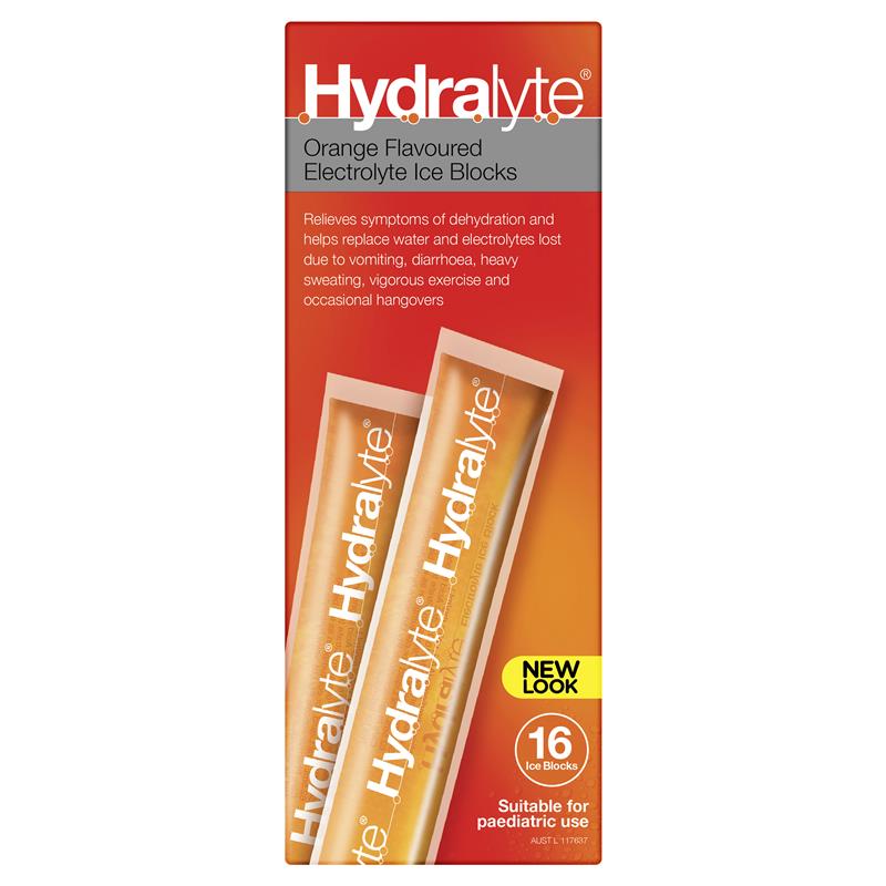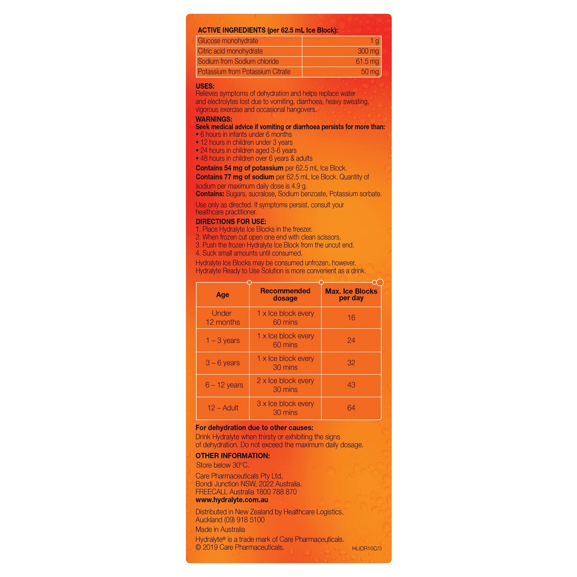 Hydralyte Electrolyte Ice Blocks Orange relieves symptoms of dehydration and helps replace water and electrolytes lost due to vomiting, diarrhoea, heavy sweating, vigorous exercise and occasional hangovers.