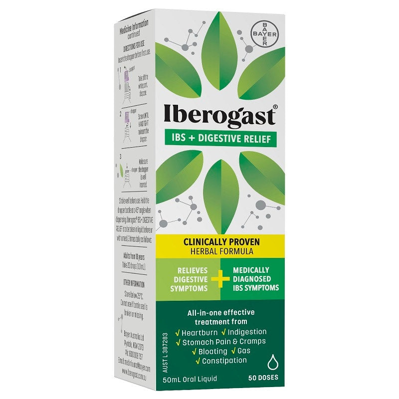Iberogast® IBS + DIGESTIVE RELIEF is a clinically proven, all-in-one herbal solution to effectively relieve 6 digestive symptoms. Iberogast® IBS + DIGESTIVE RELIEF is an effective treatment for medically diagnosed IBS and a range of digestive symptoms such as heartburn, stomach pain and cramps, indigestion, bloating and gas, constipation, diarrhoea and nausea so you can feel good on the inside.1,2Experience the power of nature with Iberogast® IBS + DIGESTIVE RELIEF, a formulation which combines the power of six medicinal herbs that have been carefully chosen and combined to work at their best together. These herbs include Iberis amara, Chamomile, Caraway, Lemon balm, Peppermint, and Liquorice.1,2