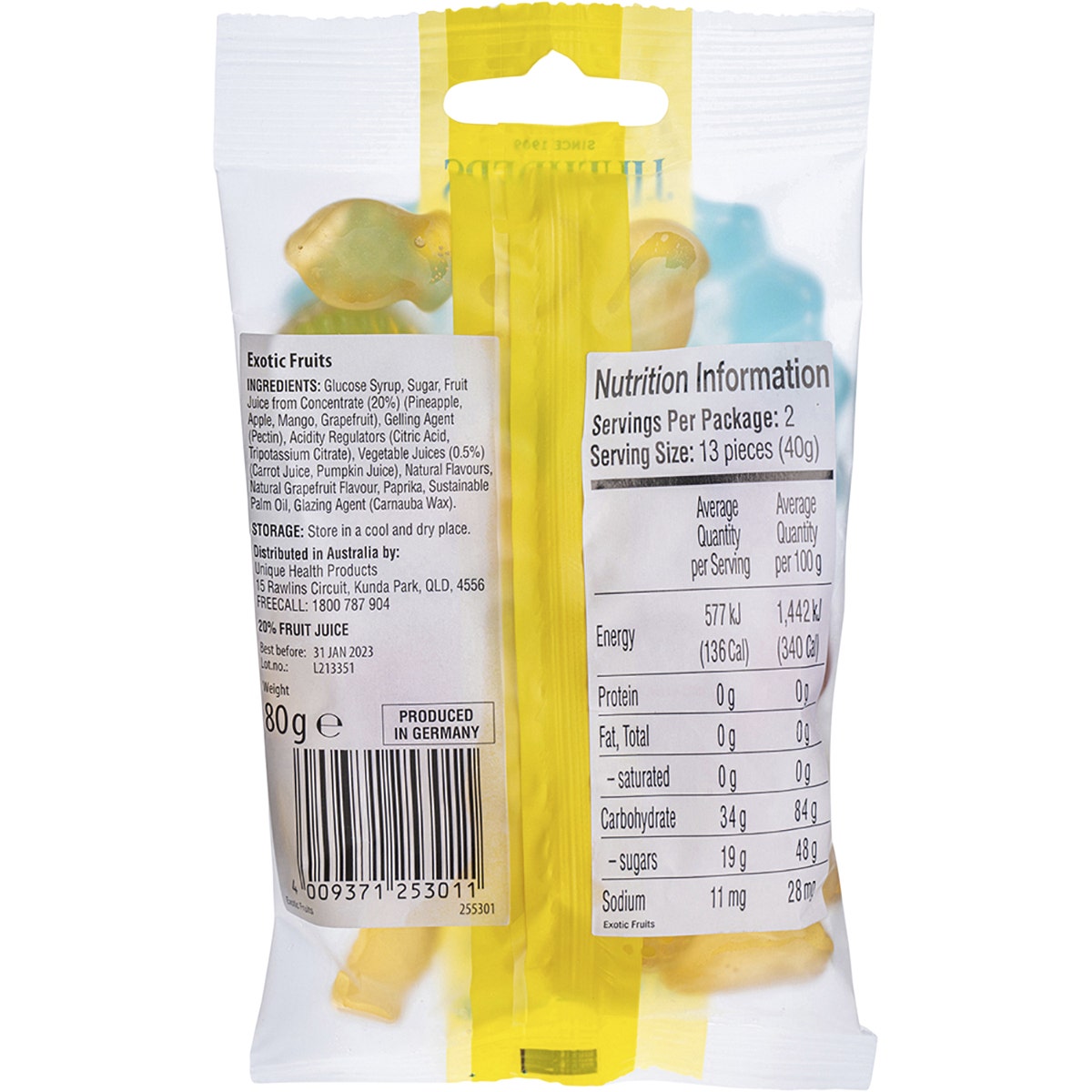 Glucose Syrup, Sugar, Fruit Juice from Concentrate (20%) (Pineapple, Apple, Mango, Grapefruit), Gelling Agent (Pectin), Acidity Regulators (Citric Acid, Tripotassium Citrate), Vegetable Juices (0.5%) (Carrot Juice, Pumpkin Juice), Natural Flavours, Natural Grapefruit Flavour, Paprika, Sustainable Palm Oil, Glazing Agent (Carnauba Wax).JL01CPP