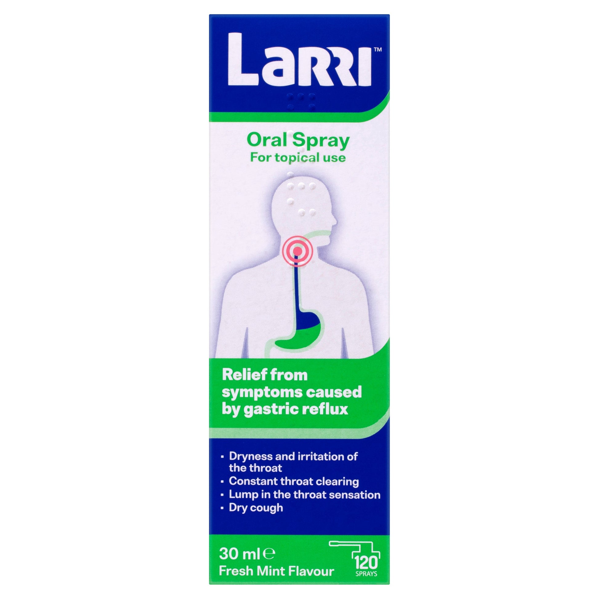 Larri Oral Spray helps relieve gastric acid reflux symptoms experienced in the throat and esophagus (food channel). It works by lubricating and lining these tissues to prevent discomfort caused by stomach acid and other contents when they travel up during reflux.