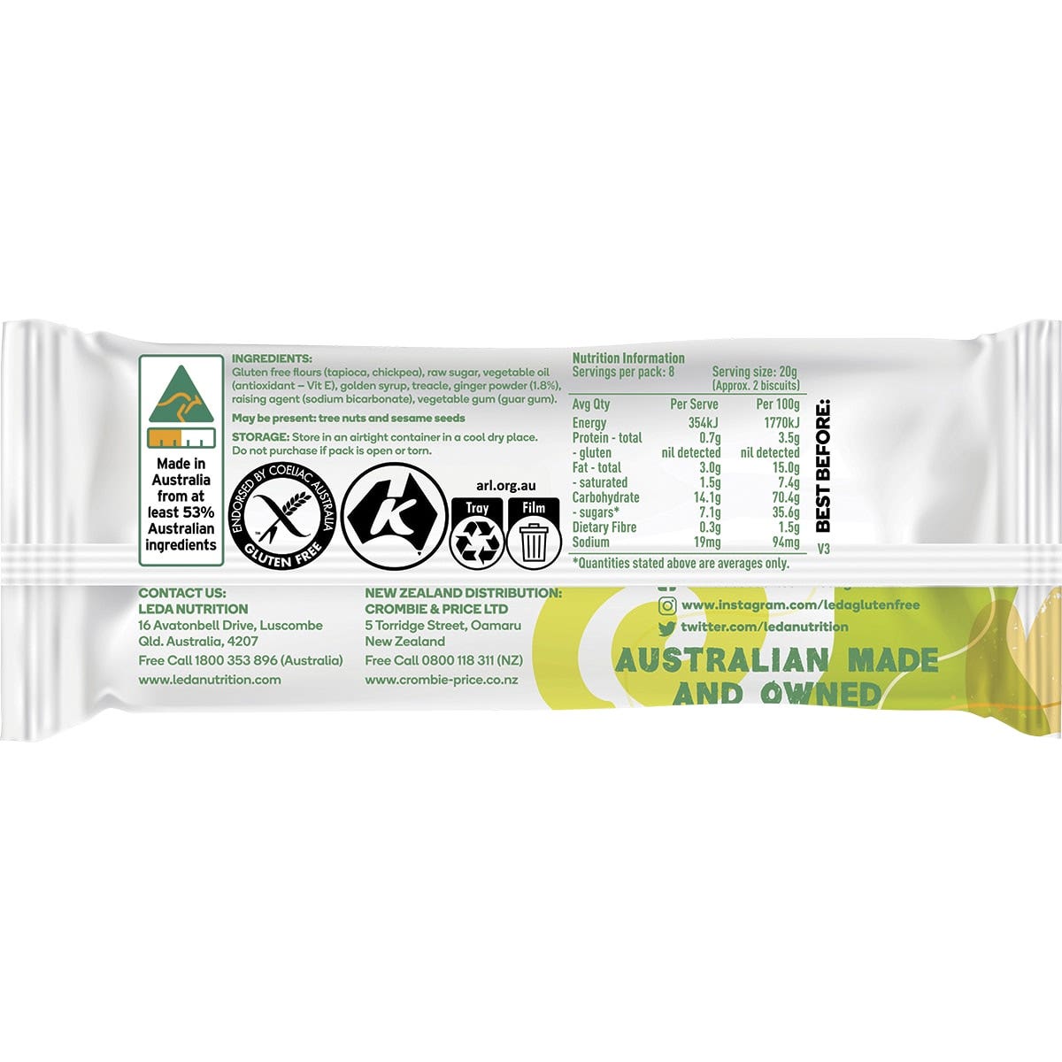 Leda Gingernut Cookies are delightfully crunchy and great for dunking. They are perfectly used as a base for desserts like cheesecake and slices. It is great for those with intolerances and gluten-free, kosher, dairy-free, wheat-free, egg-free and vegan.