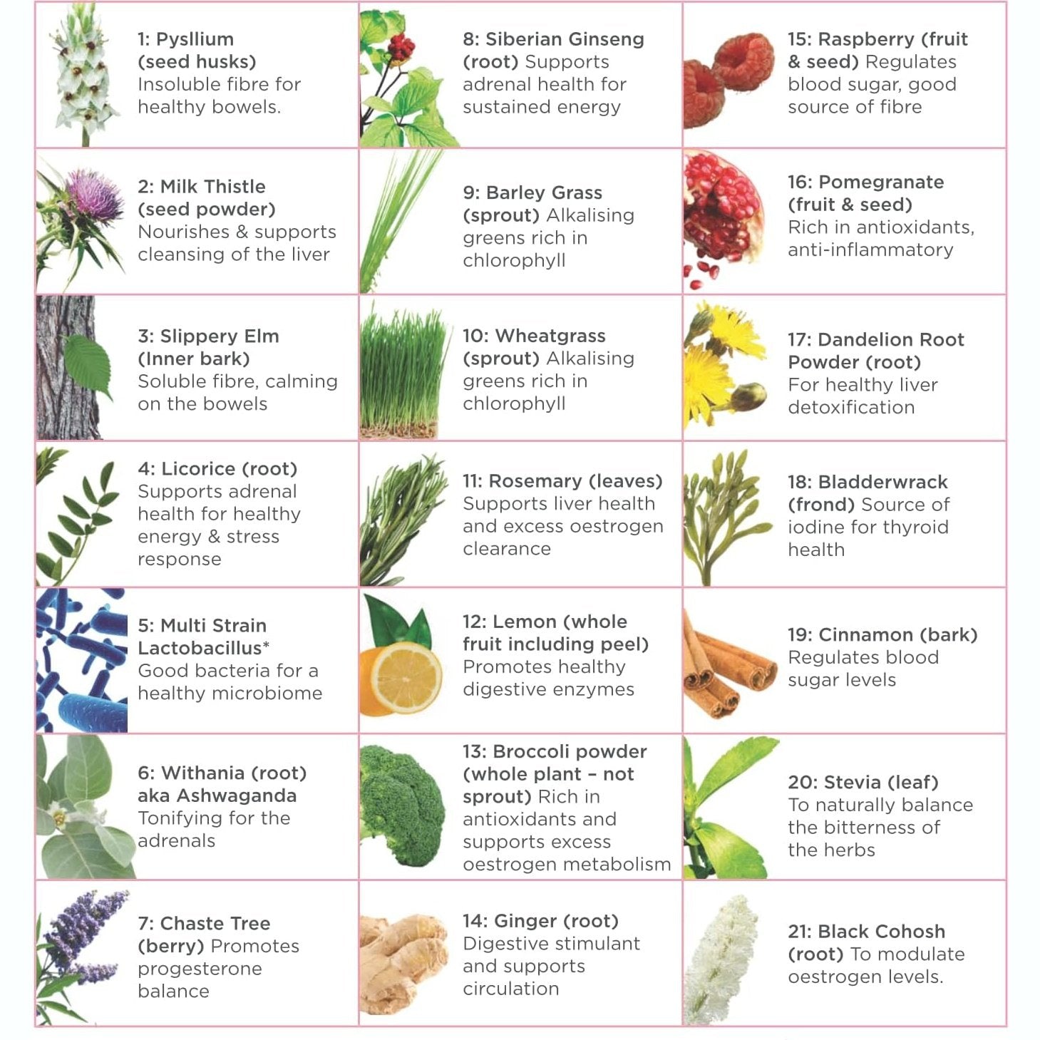 Psyllium Husks, Milk Thistle, Slippery Elm, Licorice, Multi Strain Probiotics*, Withania*, Chaste Tree Berry, Siberian Ginseng*, Barley Grass*, Wheatgrass*, Rosemary*, Lemon, Broccoli Powder, Ginger*, Raspberry, Pomegranate, Dandelion*, Bladderwrack*, Cinnamon*, Stevia*, Black Cohosh. *organic ingredients