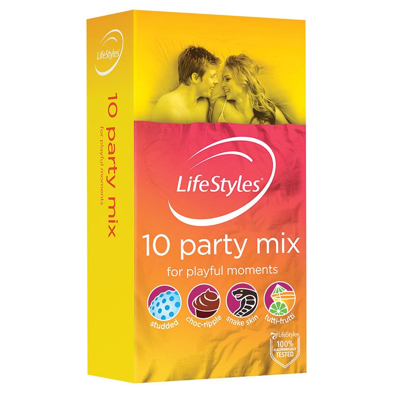 LifeStyles Party Mix Condoms contain a playful mix of assorted condoms with different features including colours, flavours, and textures. These condoms have a nominal width of 53mm, unless specified otherwise and are a straight shaped with reservoir end. These condoms are lubricated (non-spermicidal).