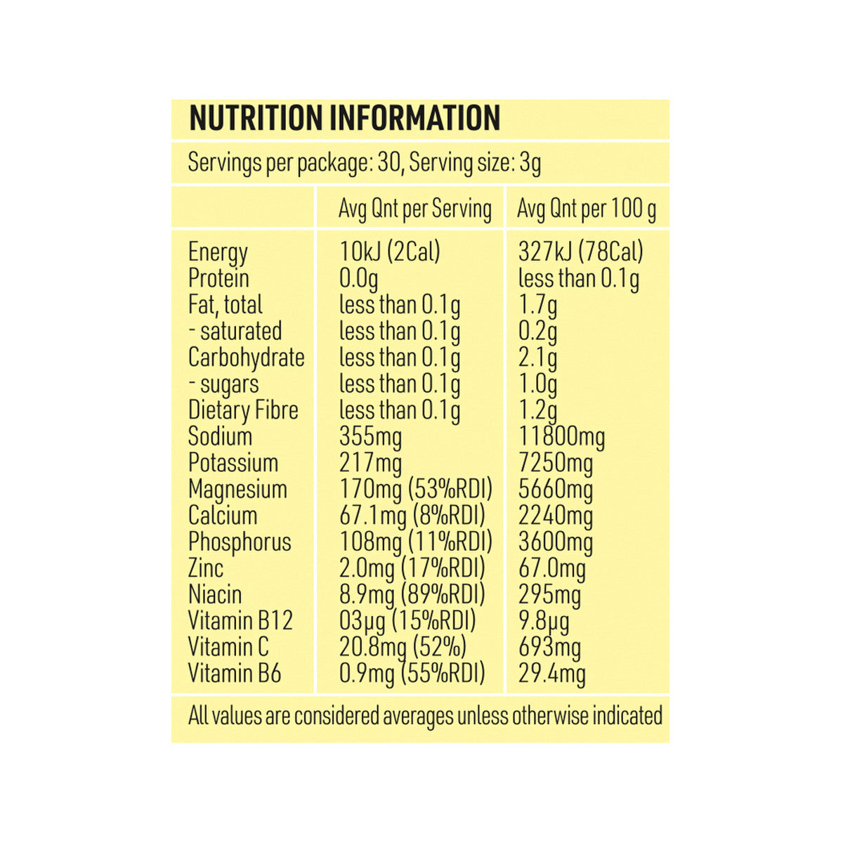 Magnesium Citrate, Salt (Sodium Chloride), Potassium Citrate, Citric Acid, Natural Flavours (Pineapple, Coconut), Calcium Phosphate, Sunflower Lecithin, Stevia, Ascorbic Acid, Zinc Gluconate, Vitamin B3, Vitamin B5, Vitamin B6, Vitamin B12.
