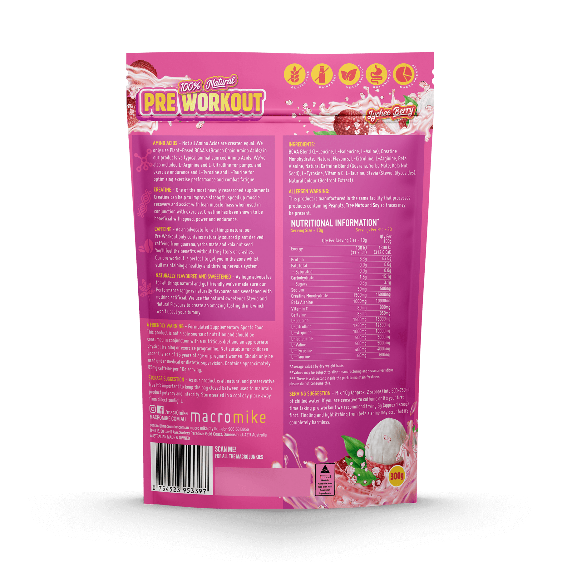 Macro Mike Pre Workout Lychee Berry is an invigorating blend of creatine, amino acids, vitamins and plant-derived caffeine to give you a completely natural boost. As huge advocates for all things natural and gut friendly, we’ve made sure our Performance range is naturally flavoured and sweetened with nothing artificial. We use the natural sweetener stevia and natural flavour essences to create an amazing tasting drink which won’t upset your tummy.
