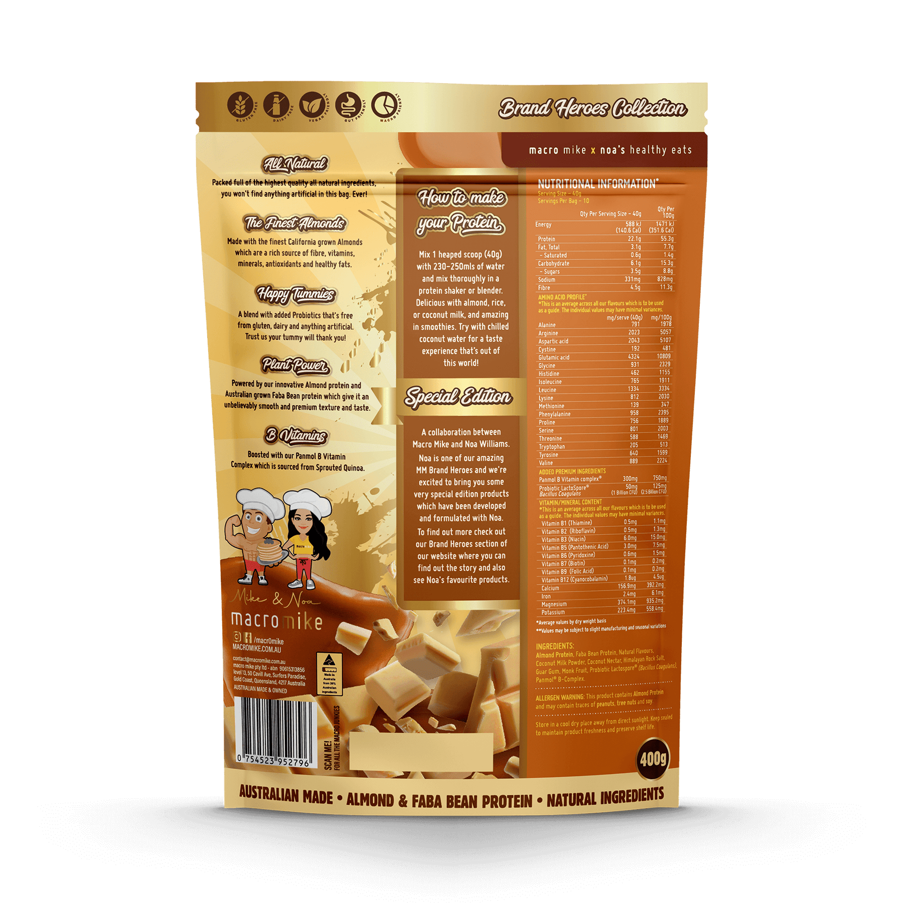 Macro Mike's 100% natural Californian Almond Protein and Australian grown Faba Bean Protein blend is silky smooth, full of fibre, vitamins, minerals and packs a huge 20g+ of plant protein. Combined with gut-loving probiotics, B vitamins and nothing artificial whatsoever, it really is unlike anything else on the market. More so, this comprehensive blend is naturally sweetened with delicious coconut flower nectar and innovative monk fruit, which contains no carbs, no calories, does not raise blood sugar levels and is gut friendly too.