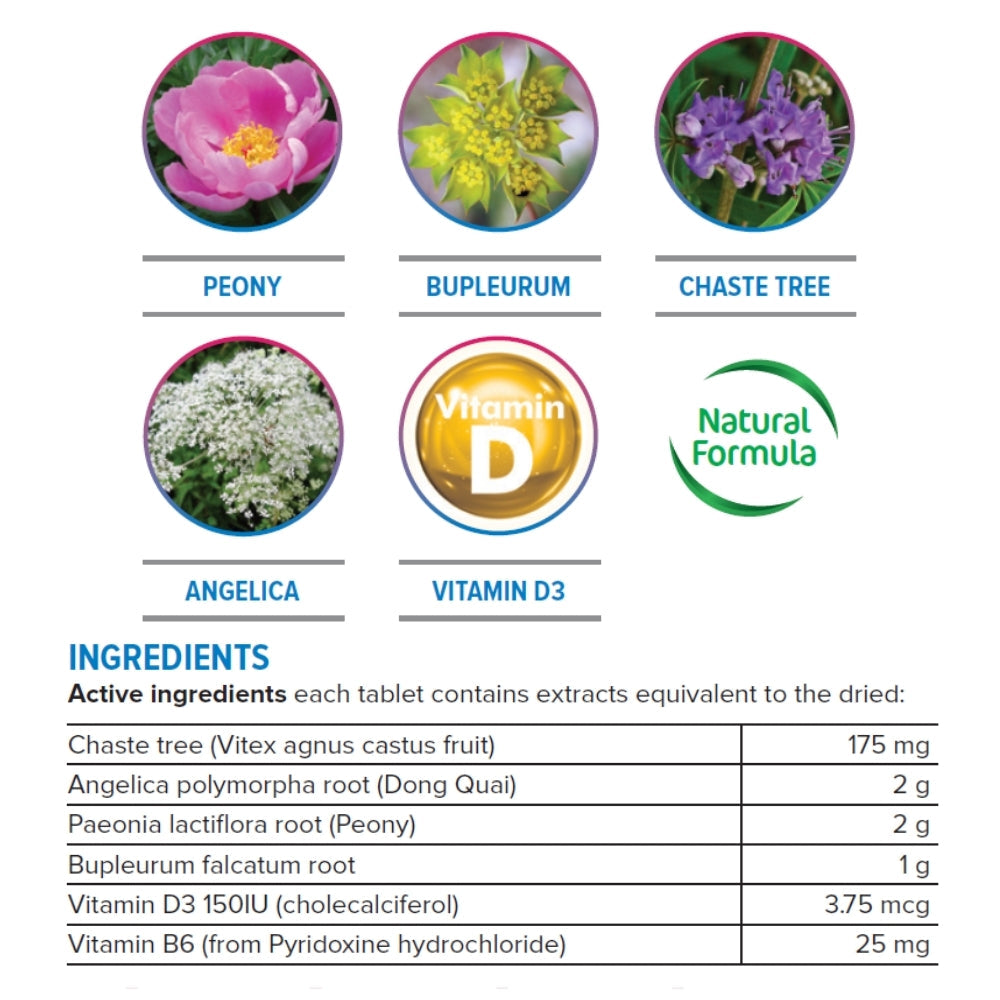 Each tablet contains extract equivalent to the dried herbs: Vitex Agnus-Castus Fruit (Chaste Tree): 175mg, Angelica Polymorpha Root (Dong Quai): 2g, Paeonia Lactiflora Root (Peony): 2g, Bupleurum Falcatum Root: 1g Also including naturally derived excipients: Calcium Hydrogen Phosphate, Cellulose – Microcrystalline, Croscarmellose Sodium, Hypromellose, Silica – Colloidal Anhydrous, Magnesium Stearate, Chlorophyllin – Copper Complex, Carnauba Wax. Tablet coating proprietary ingredient PI 4029. Vitamin D3 150IU (Cholecalciferol): 3.75ug Vitamin B6 (from Pyridoxine Hydrochloride): 25m.MP51CPP