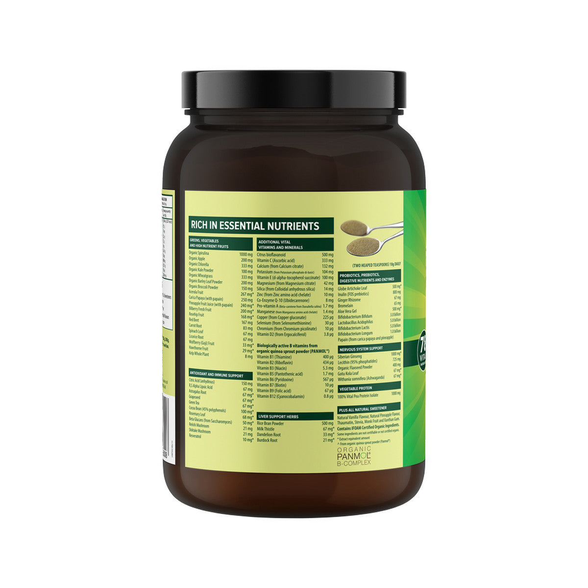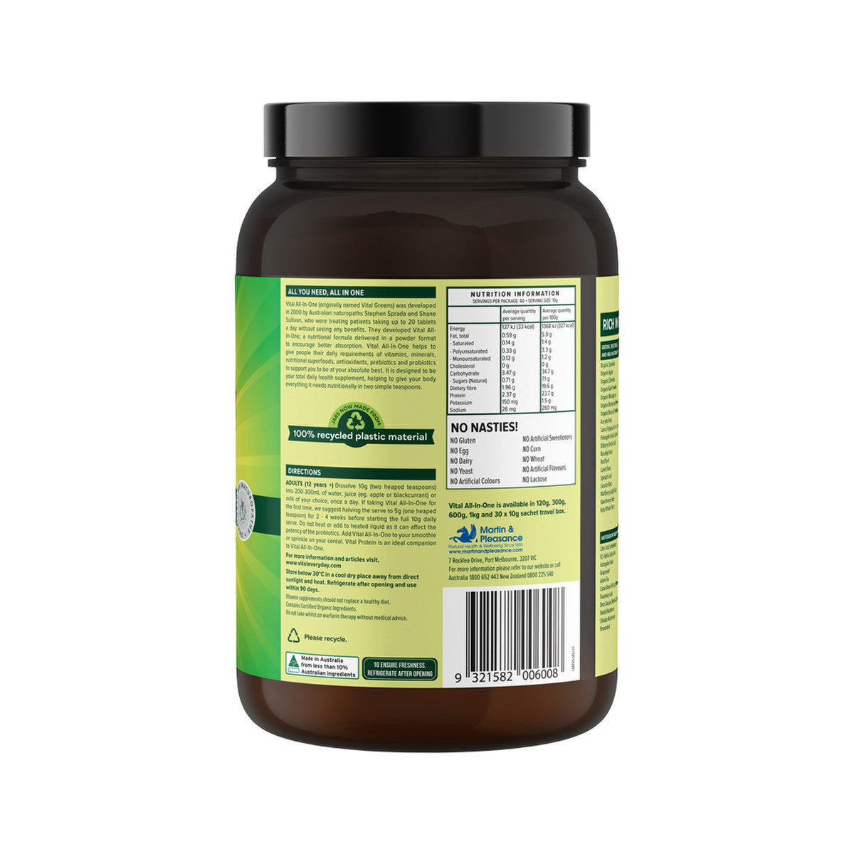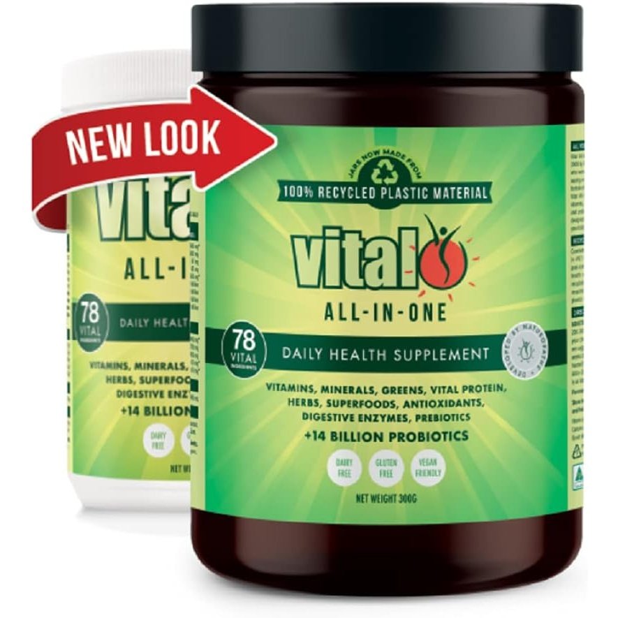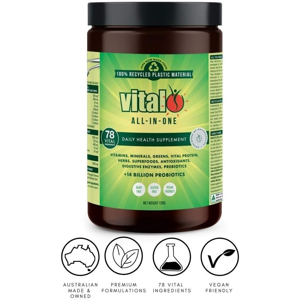 Vital Greens, now named Vital All-In-One, was the first product developed under the Vital Brand in early 2000. The formula is an easily absorbed, carefully balanced powder blend of essential nutrients that have been extracted from natural dense vegetables and fruits plus the addition of probiotics, herbs, vitamins and minerals. Recently the formula was renamed Vital All-In-One to highlight the product is more than greens, emphasising it is a comprehensive supplement. Just two teaspoons daily of Vital All-In-One delivers 78 vital ingredients that are loaded with probiotics, prebiotics, vitamins, minerals, antioxidants, essential fatty acids, fibre and a unique high alkalising pea protein.