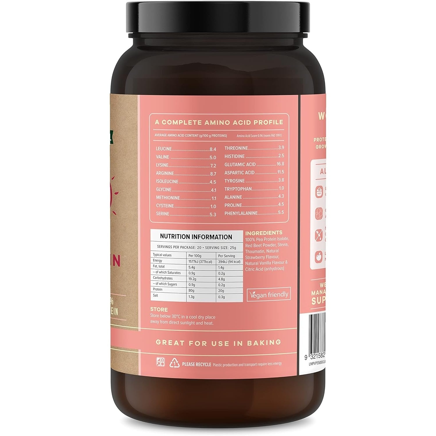 100% Pea Protein isolate, Re Beet Powder, Stevia, Monk Fruit, Thaumatin, Natural Strawberry Flavour, Natural Vanilla Flavour, Citric Acid (anhydrous)