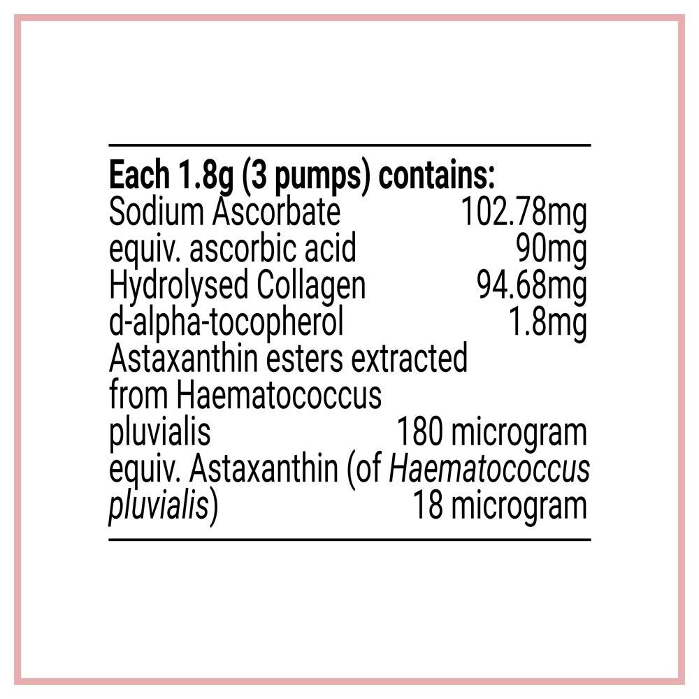 Marine Hydrolysed collagen + Astaxanthin with nutrient cofactors like vitamin C to support skin health.