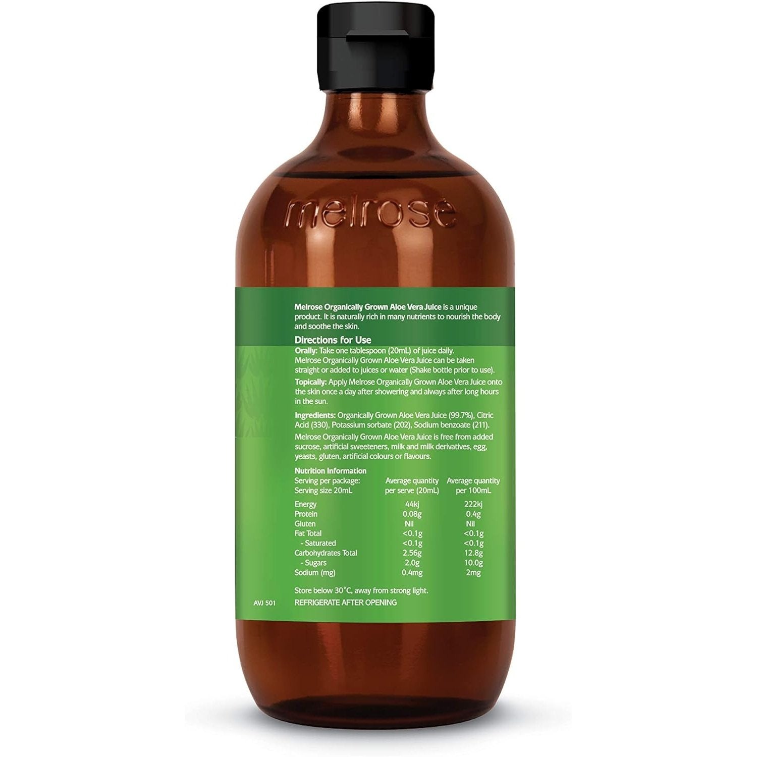 Melrose Aloe Vera Juice may help the digestive system function normally. It is rich in nutrients, may balance overly acidic dietary habits and may help maintain healthy intestinal bacteria while alkalising and detoxing the body. Melrose Aloe Vera includes minerals and antioxidants that can be applied externally as well. It contains skin-soothing properties which moisturise the skin and provides many other essential nutrients for healthier-looking skin. Melrose Aloe Vera Juice is also great as an after-sun soother.