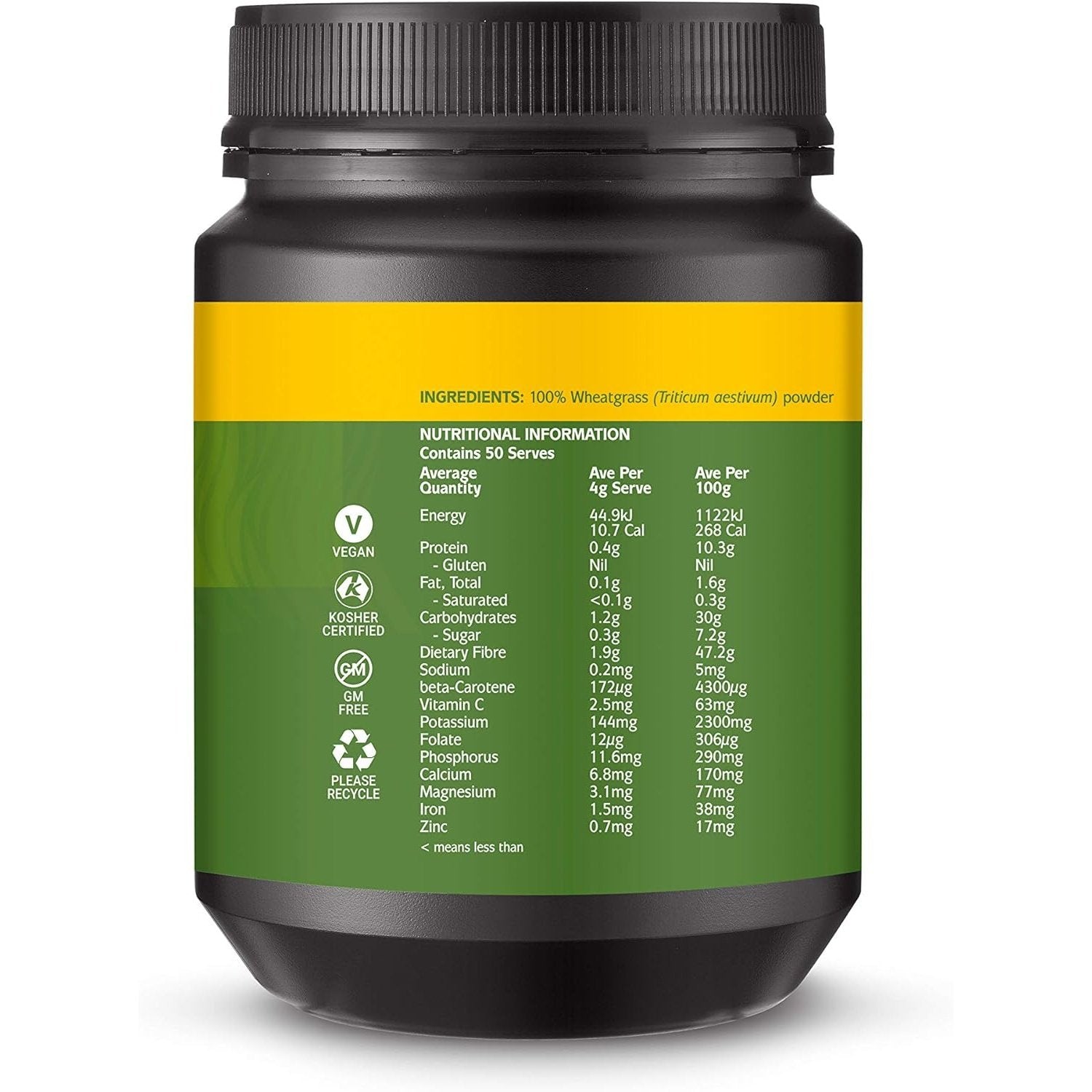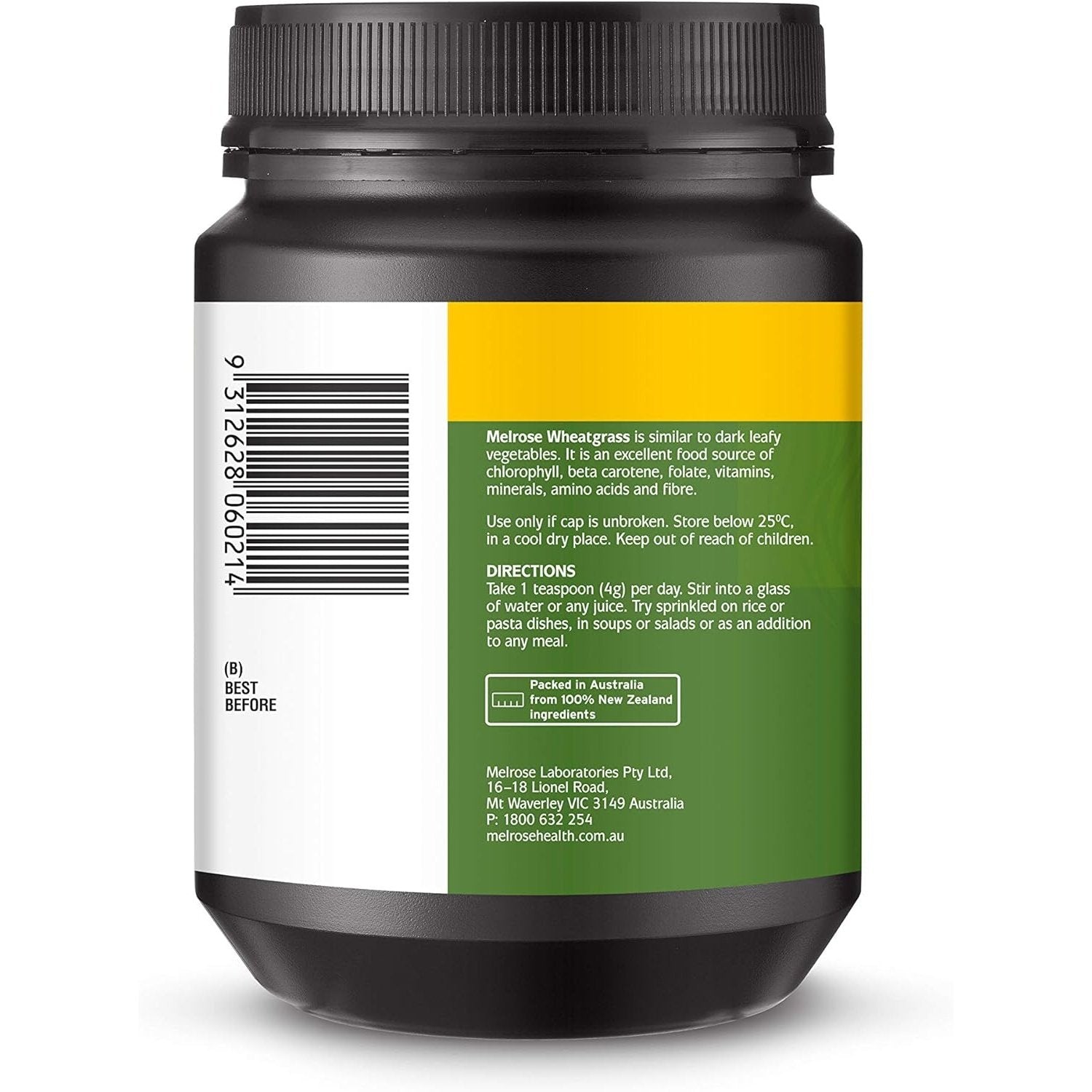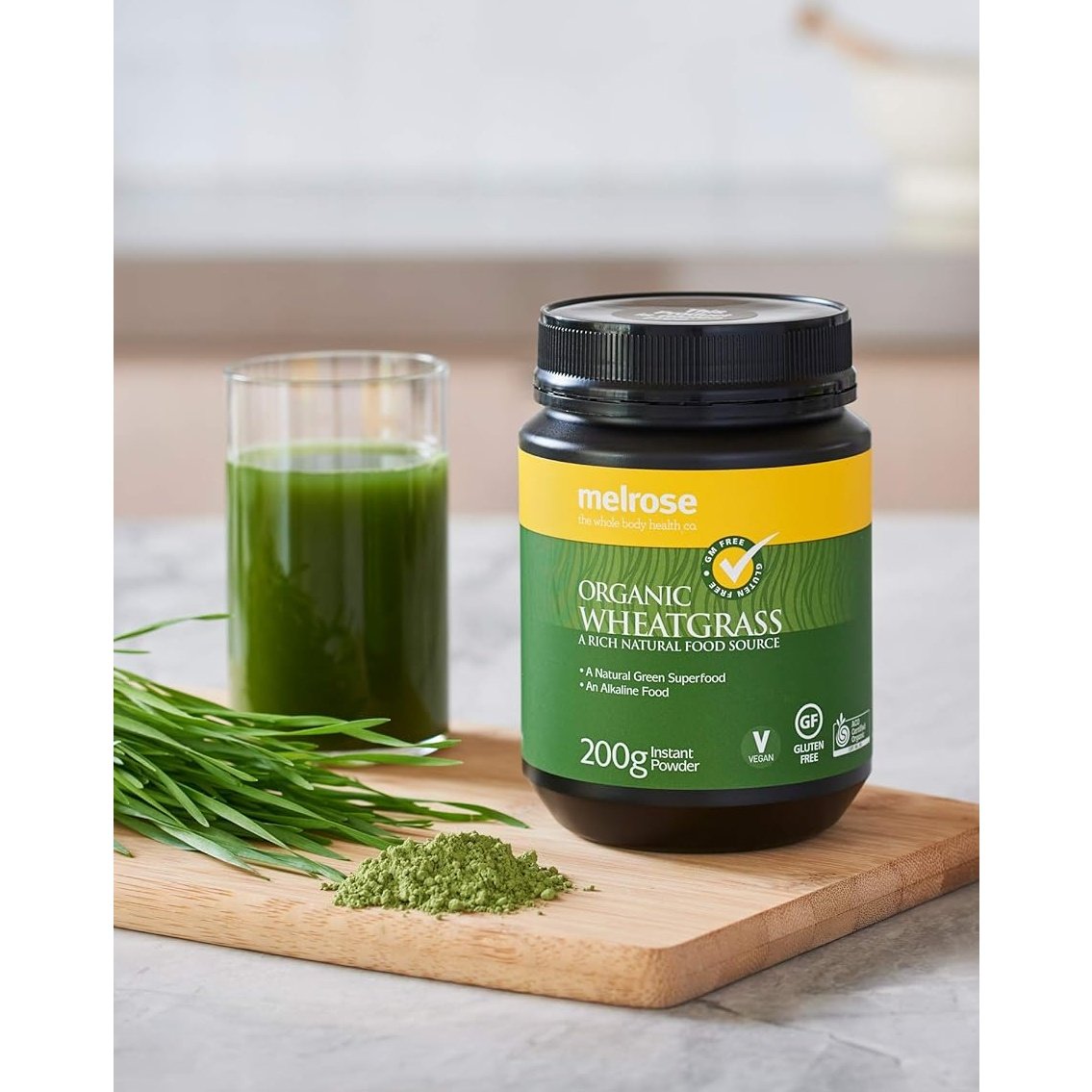 Melrose Organic Wheatgrass is a wholesome green superfood made from the powdered dehydrated leaves of organically grown young wheat plants, providing a good supplement for diets deficient in green vegetables. Wheatgrass naturally contains dietary fibre, minerals, vitamins, antioxidants, chlorophyll and folate, an essential B vitamin.
