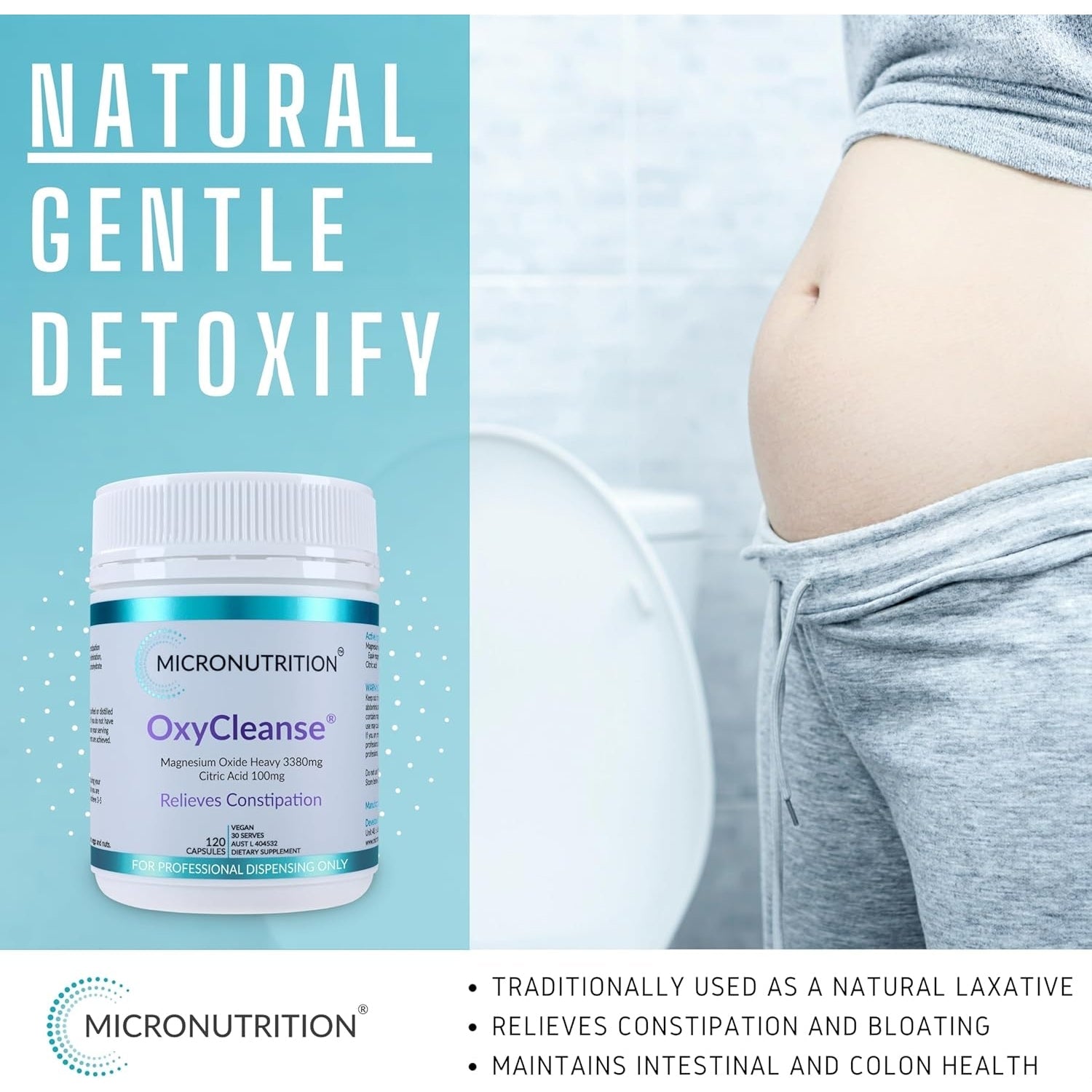 OxyCleanse® may assist in relieving occasional constipation by increasing water in the intestines. It promotes elimination, supports energy production, and also promotes carbohydrate metabolism in the body.