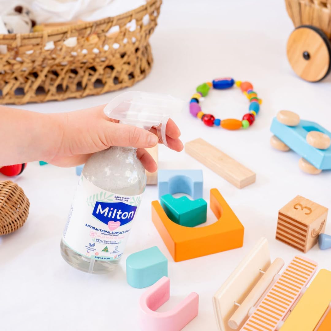 Gentle, the Milton Antibacterial Surface Spray has been especially formulated to clean and disinfect all surfaces in baby's home with no need to rinse. highchair, kitchen, fridge, workshops, bathroom, potty, baby's bath. Bleach-free with a lovely fresh scent.- Perfect around baby.