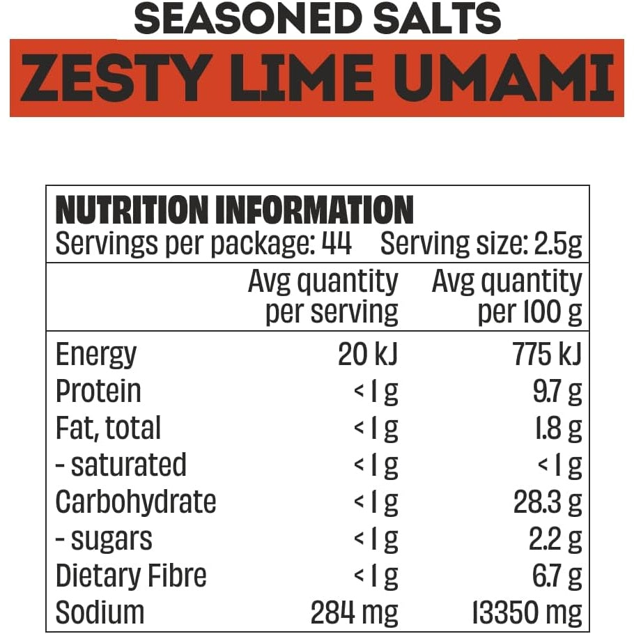 Australian Sea Salt, Onion, Garlic, Vitamin C, Yeast Extract (Yeast Extract, Salt), Paprika Extract, Chilli Powder (1%), Rice Hull, Lime Powder (0.3%), Natural Lime Flavour.