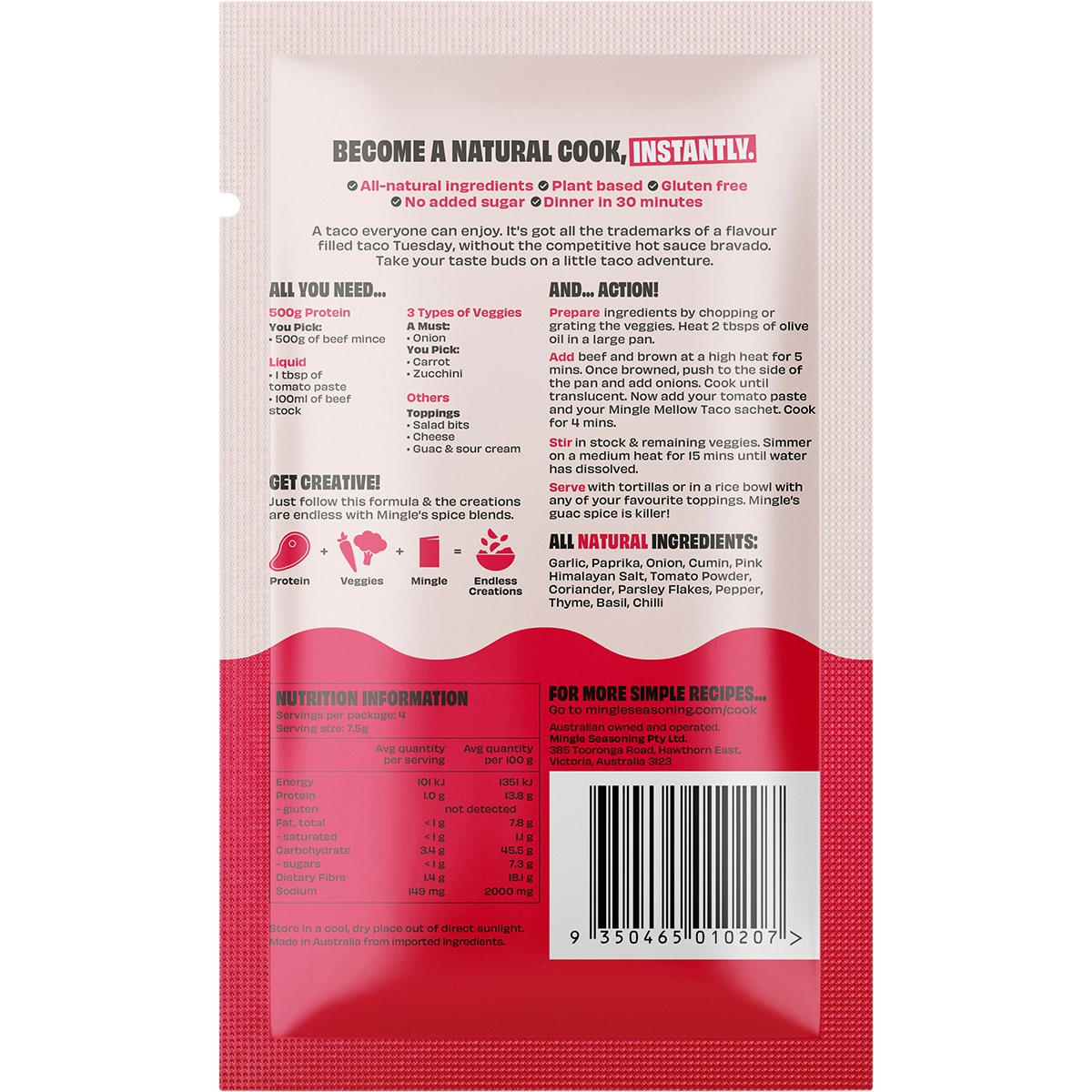 Mingle's Mellow Taco recipe base contains a unique blend of all natural ingredients, without any artificial preservatives or MSG. Enjoy a delicious and healthier twist on traditional tacos with Mingle, while adding a flavorful and nutritious touch to your meals.