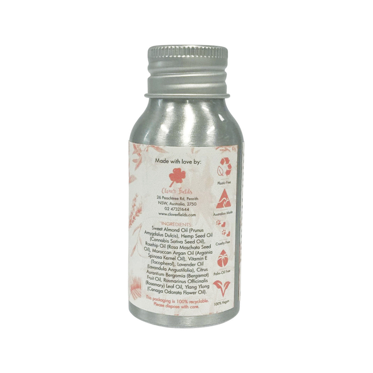 Sweet Almond Oil (Prunus Amygdalus Dulcis), Hemp Seed Oil (Cannabis Sativa Seed Oil), Rosehip Oil (Rosa Moschata Seed Oil), Moroccan Argan Oil (Argania Spinosa Kernel Oil), Vitamin E (Tocopherol), Lavender Oil (Lavandula Angustifolia), Citrus Aurantium Bergamia (Bergamot) Fruit Oil, Rosmarinus Officinalis (Rosemary) Leaf Oil, Ylang Ylang (Canaga Odorata Flower Oil)