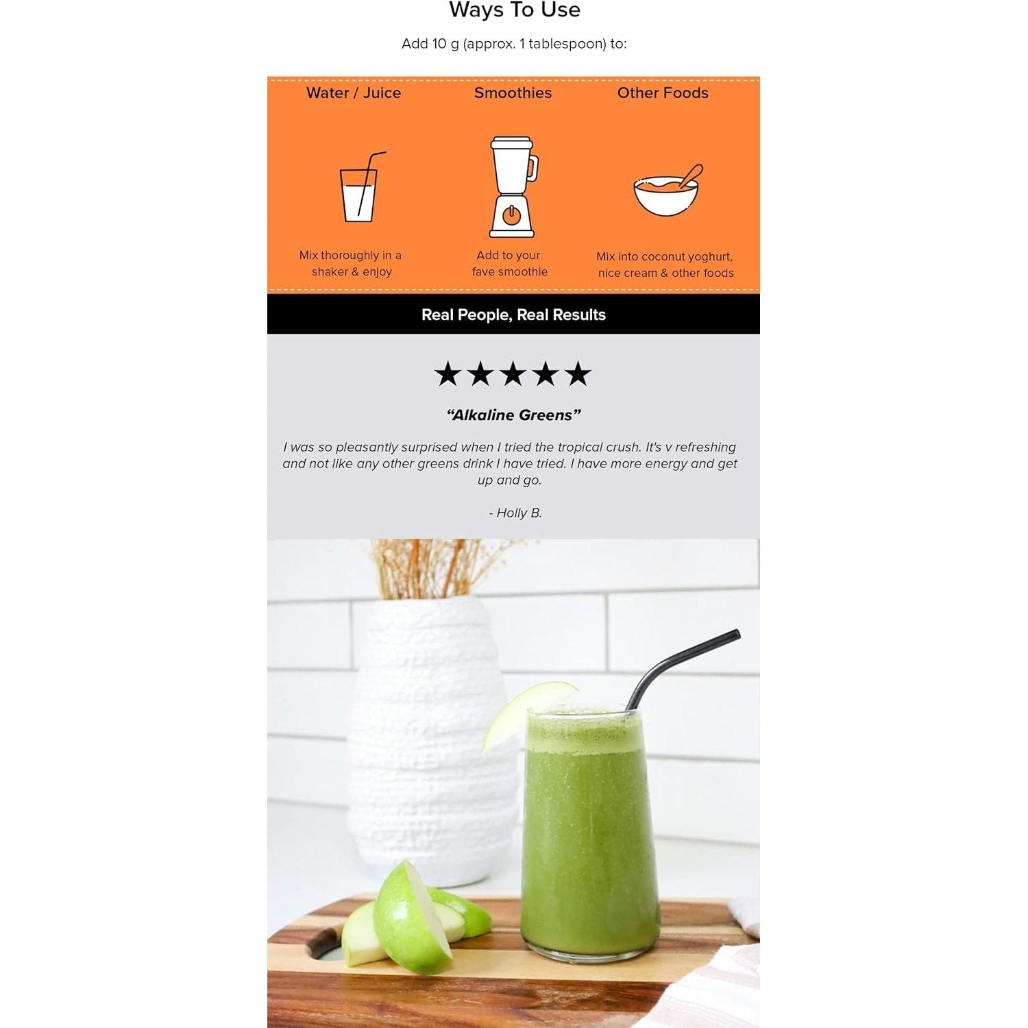 Add 10 g (approx. 1 tbsp.) to 200 mL chilled water, juice, smoothies, yoghurt, or any other food. Consume up to twice daily.