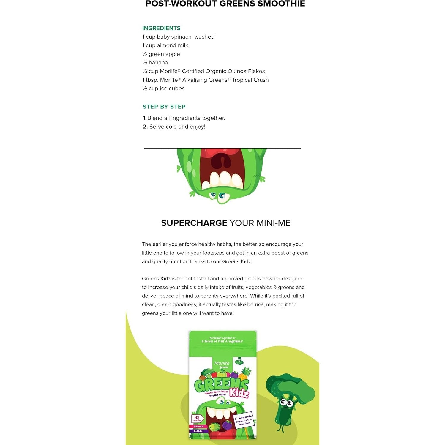 Greens, Fruits & Vegetables (45%*) (Mango, Pineapple, Peach, Banana, Alfalfa+, Broccoli Sprout, Buckwheat Lettuce, Apple, Lemon, Lime, Chlorella+, Spirulina+, Nettle+, Peppermint+, Kale+, Matcha Green Tea+, Celery, Spinach+, Parsley, Cucumber), Magnesium Citrate, Natural Fruit Flavours, Potassium Citrate, L-Glutamine, Calcium Citrate, Extracts (Dandelion Leaf, Eleuthero, Turmeric, Spirulina, Ashwagandha, Green Tea, Rosemary, Aloe Vera, Gardenia, Black Pepper), Magnesium Gluconate, Prebiotic Fibre (Apple, Acacia), L-Alanine, Stabiliser (Xanthan Gum), L-Histidine, Probiotics (Lactobacillus acidophilus, Bifidobacterium lactis, Bifidobacterium bifidum, Bifidobacterium longum), Potassium Ascorbate, Acidity Regulator (Citric Acid), Zinc Gluconate, Ferrous Fumarate (Iron), Manganese Citrate, Seleno Methionine, Plant Vitamin D, Chromium Picolinate. *Average Quantity +Certified Organic by ACO Certification Ltd.