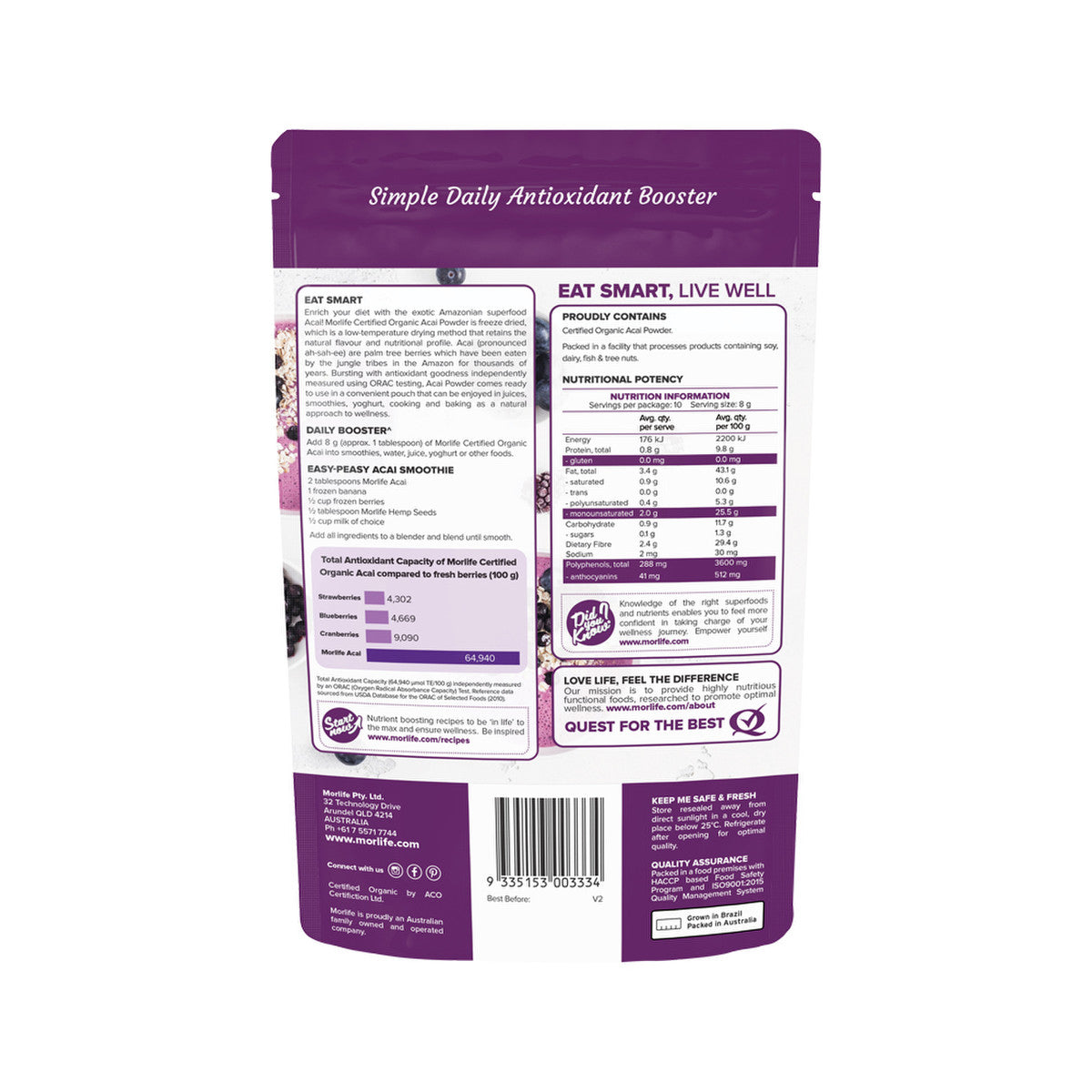 Add 8 g (approx. 1 tablespoon) of Morlife Certified Organic Acai into smoothies, water, juice, yoghurt or other foods.