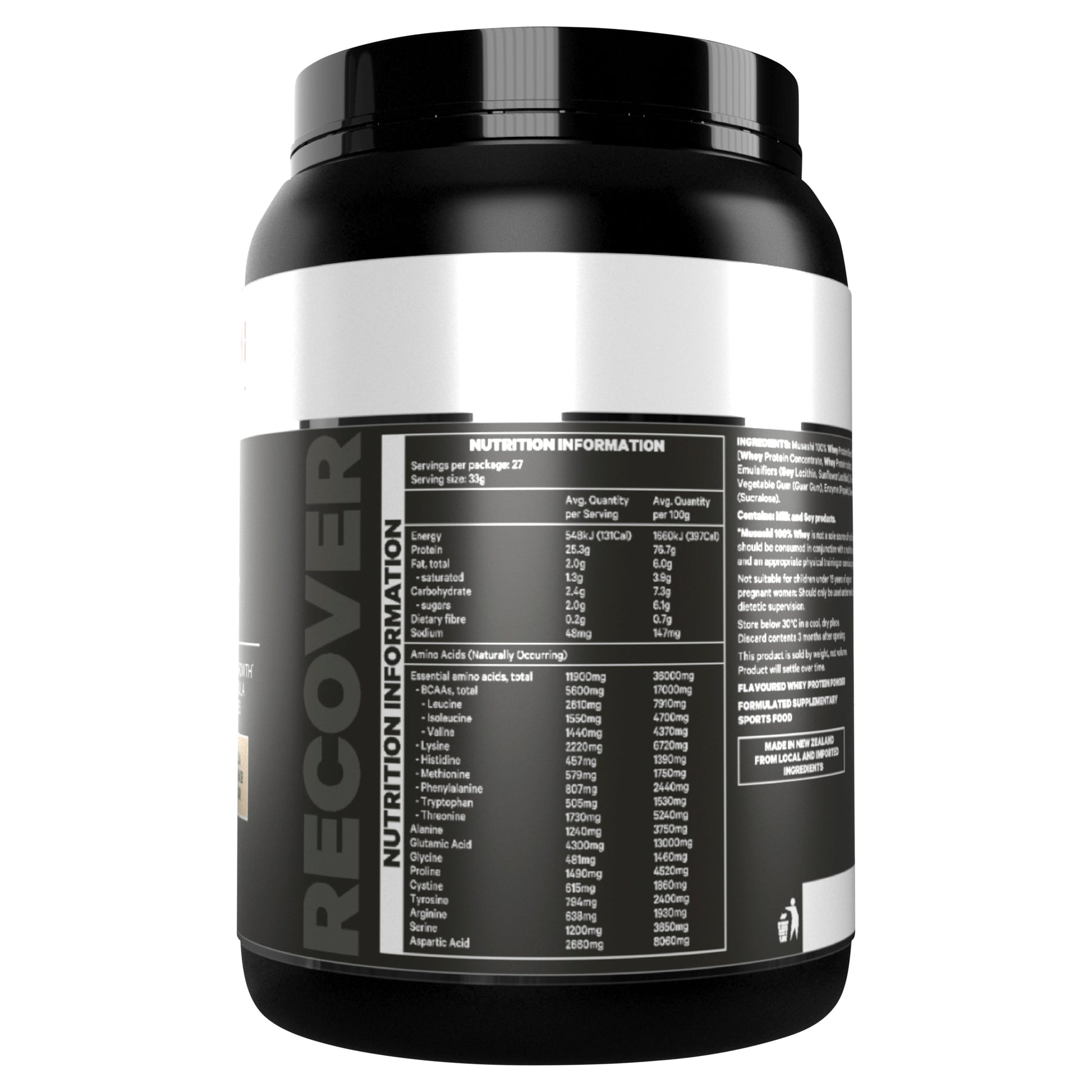 Musashi 100% Whey Protein Blend (98%) [Whey Protein Concentrate, Whey Protein Isolate, Emulsifiers (Soy Lecithin, Sunflower Lecithin)], Flavours, Vegetable Gum (Guar Gum), Enzyme (Papain), Sweetener (Sucralose).