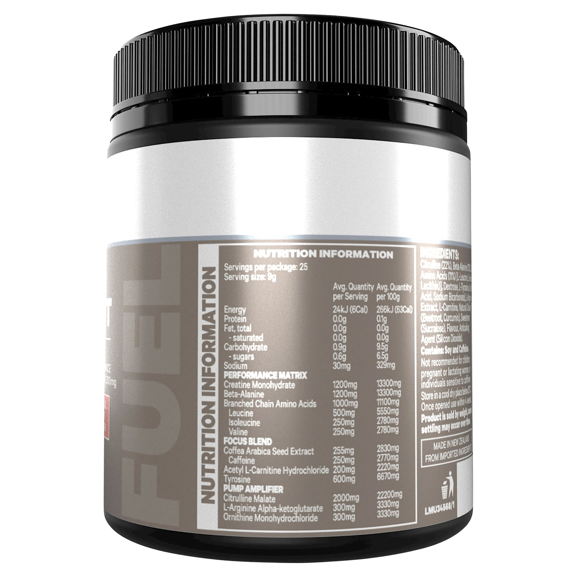 Citrulline (22%), Beta Alanine (13%), Creatine (13%), Bracnhed Chain Amino Acids (11%) [L-Leucine, L-Isoleucine, L-Valine, Emulsifier (Soy Lecithin)], Dextrose, L-Tyrosine, Acidity Regulators (Malic Acid, Citric Acid, Sodium Bicarbonate), L-Arginine, L-Ornithine, Coffee Bean Extract, L-Carnitine, Sweetener (Sucralose), Natural Colour (Grape Skin Extract), Anticaking Agent (Silicon Dioxide), Flavour.