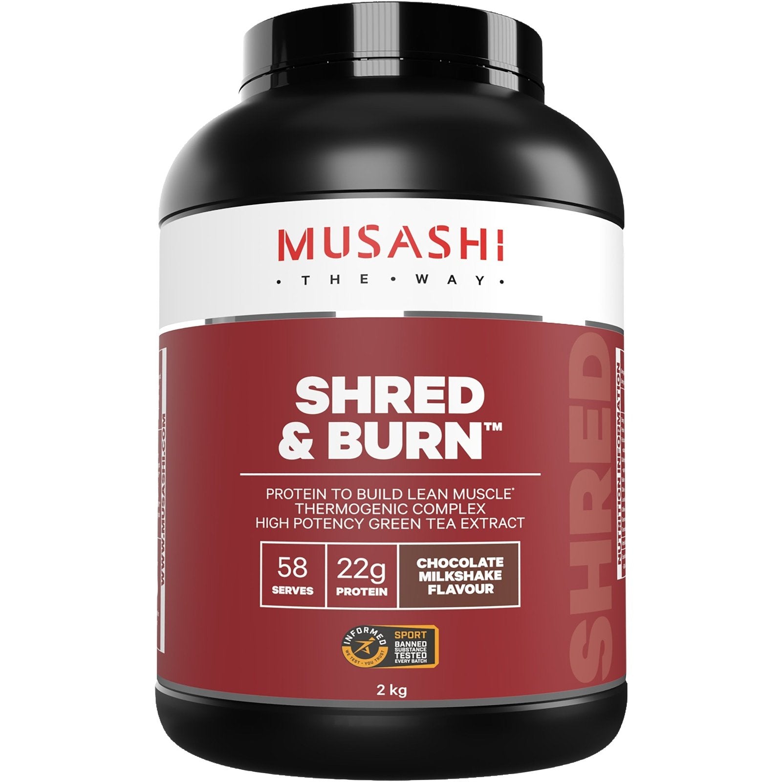 Musashi Shred and Burn™ Protein Blend (93%) [Whey Protein Concentrate, Whole Milk Powder, Whey Protein Isolate, Emulsifiers (Soy Lecithin, Sunflower Lecithin)], Cocoa Powder, Flavour, Vegetable Gum (Guar Gum), Sweetener (Sucralose), Caffeine, L-Carnitine, Enzyme (Papain), Green Tea Extract, Green Coffee Extract, Choline Bitartrate.