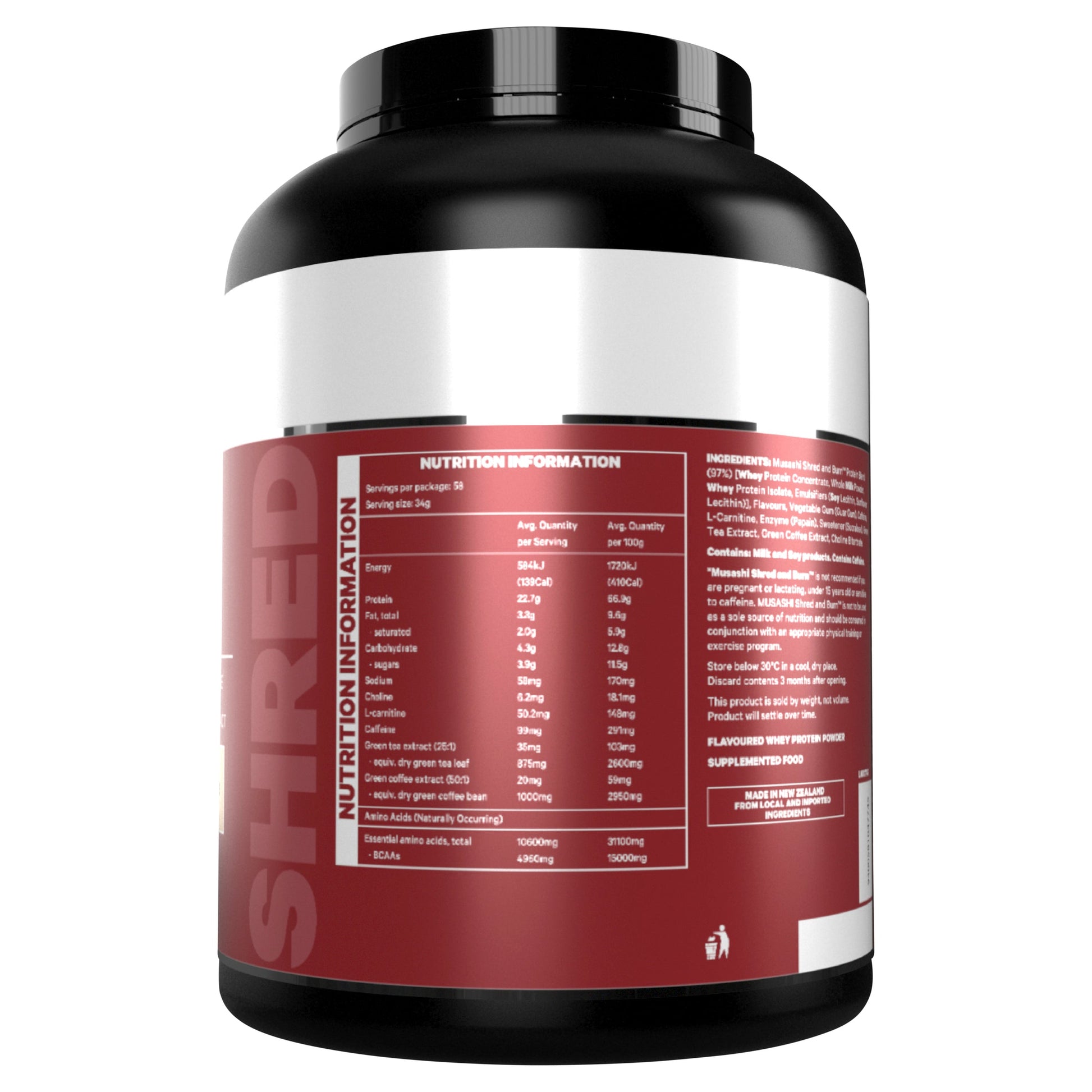 MUSASHI SHRED AND BURN TM is an optimised protein powder providing you with a powerful blend of active ingredients designed to support your lean muscle goals. MUSASHI SHRED AND BURN TM is scientifically formulated using Whey protein Concentrate and Whey Protein Isolate in an advanced muscle shredding complex. This lean muscle formula is enhanced with key SHRED AND BURN ingredients: L-carnitine and Green Tea extract to support your goals in a delicious formula that tastes great and mixes with ease.