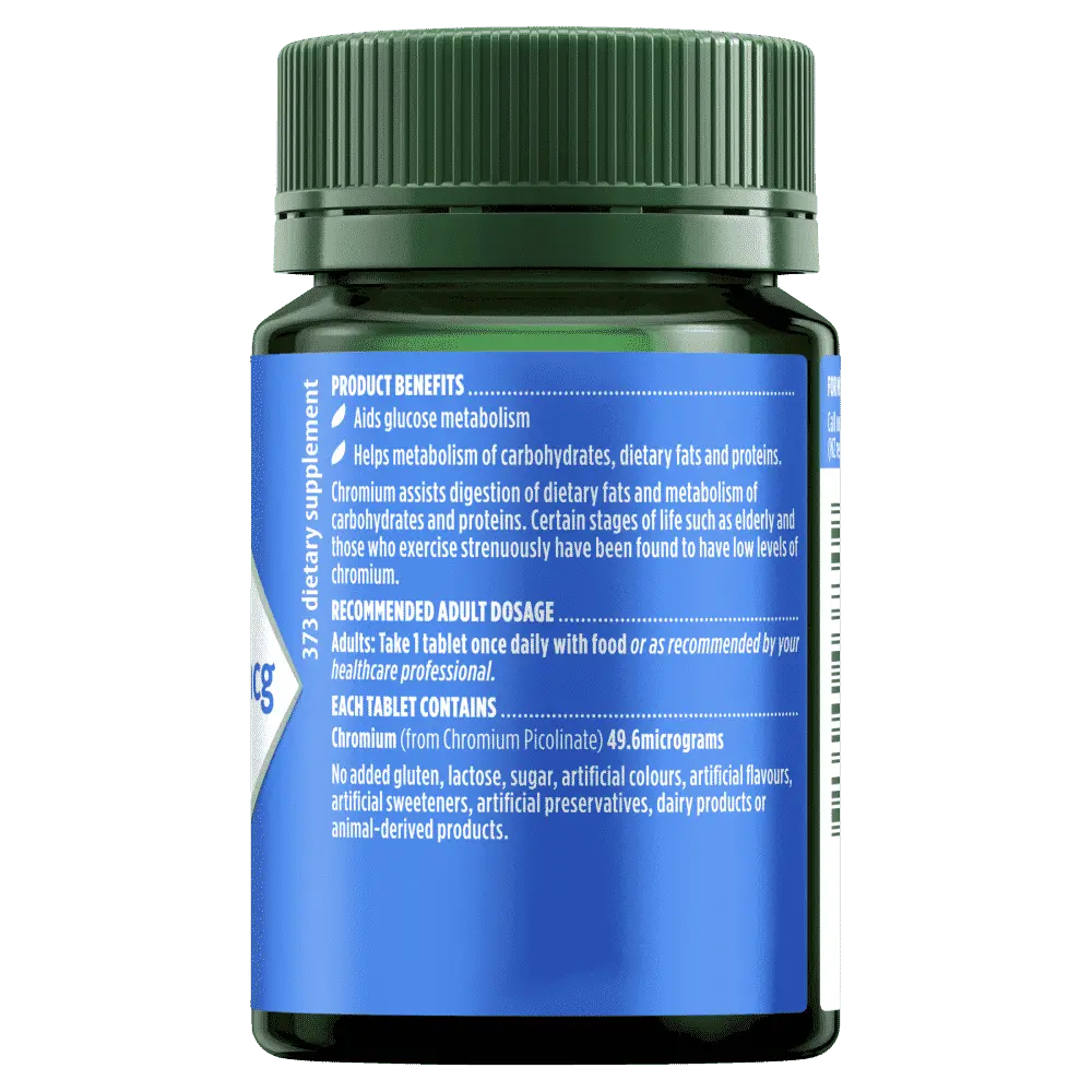 Chromium provides support for glucose metabolism and helps the body metabolize protein, carbohydrates, and fats. Chromium may also support the movement of glucose into cells. Chromium needs are increased after strenuous exercise and also during times of stress or pregnancy.
