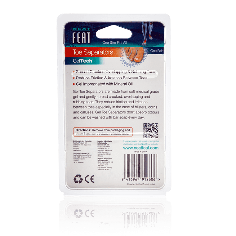 Gel Toe Separators are made from soft medical grade gel and gently spread crooked, overlapping and rubbing toes. They reduce friction and irritation between toes especially in the case of blisters, corns and calluses. Gel toe separators don't absorb odours and can be washed with bar soap every day.