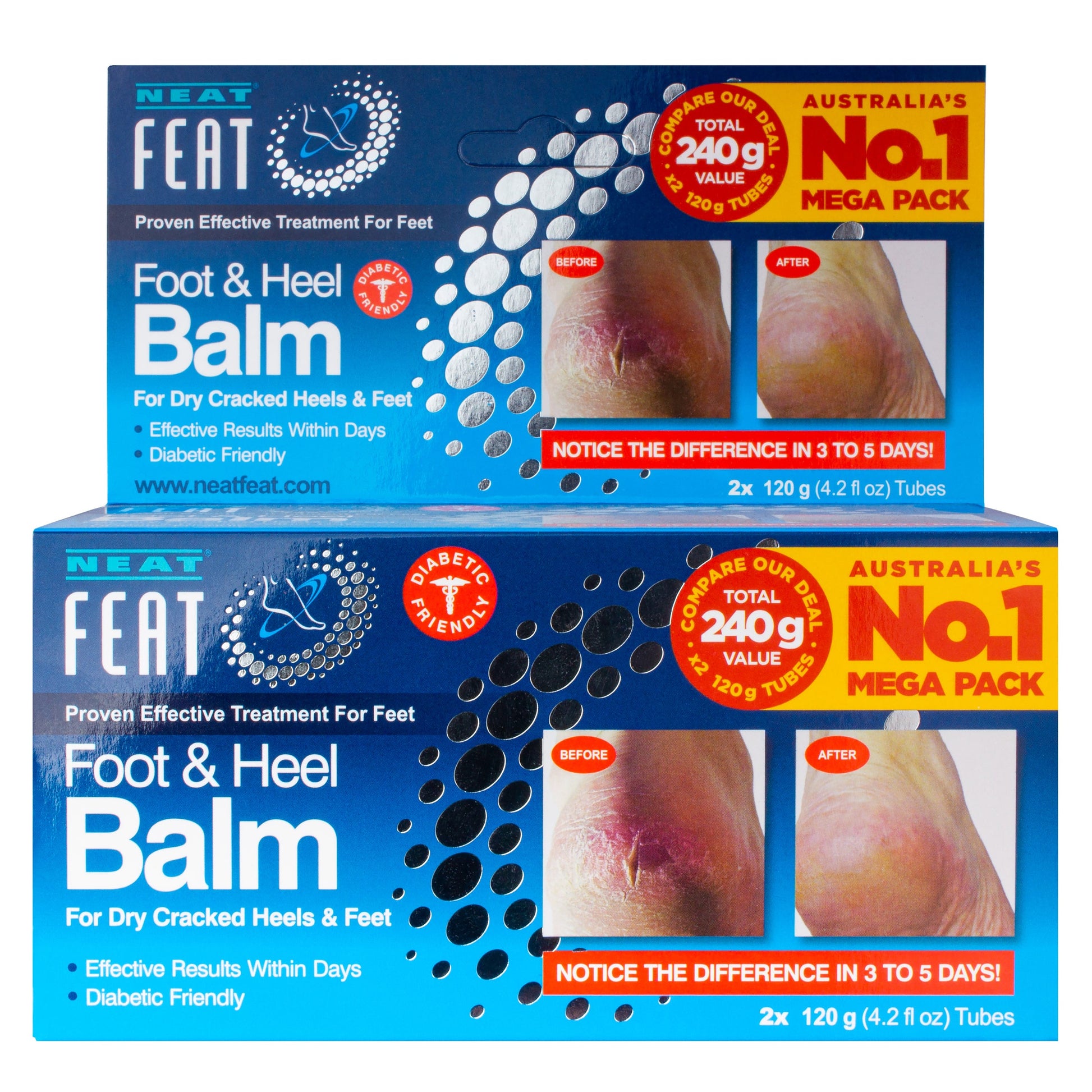 Neat Feat's Heel Balm is an oil based products, this enables the balm to stay over the affected area, and the active ingredient rehydrates the skin, repairing damage with noticeable results within 5 days. Neat Feat Heel Balm 75g - 2 for the price of 1.
